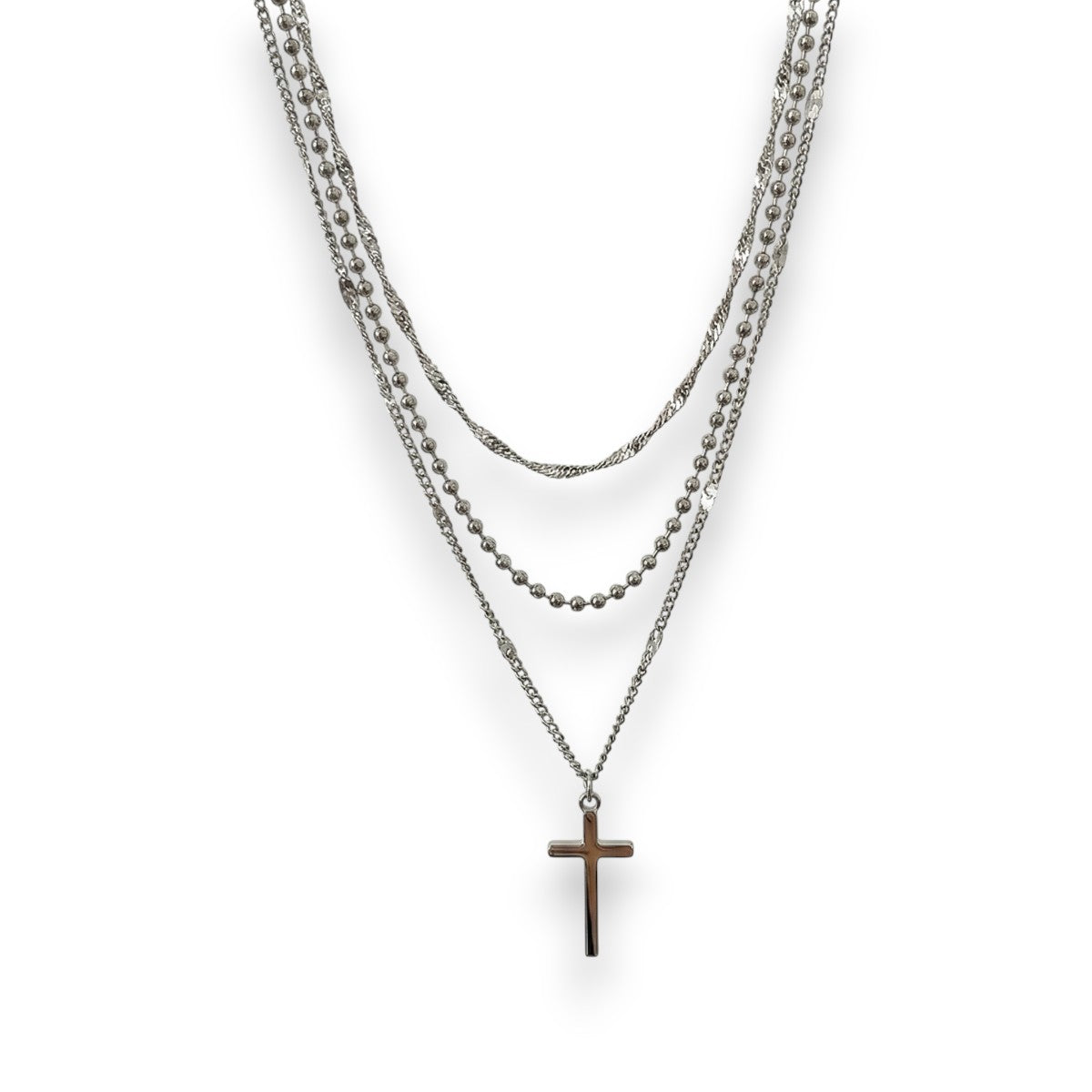 Αλυσίδα λαιμού ατσάλινη τριπλή με σταυρό χρώμα ασημί (N1373)