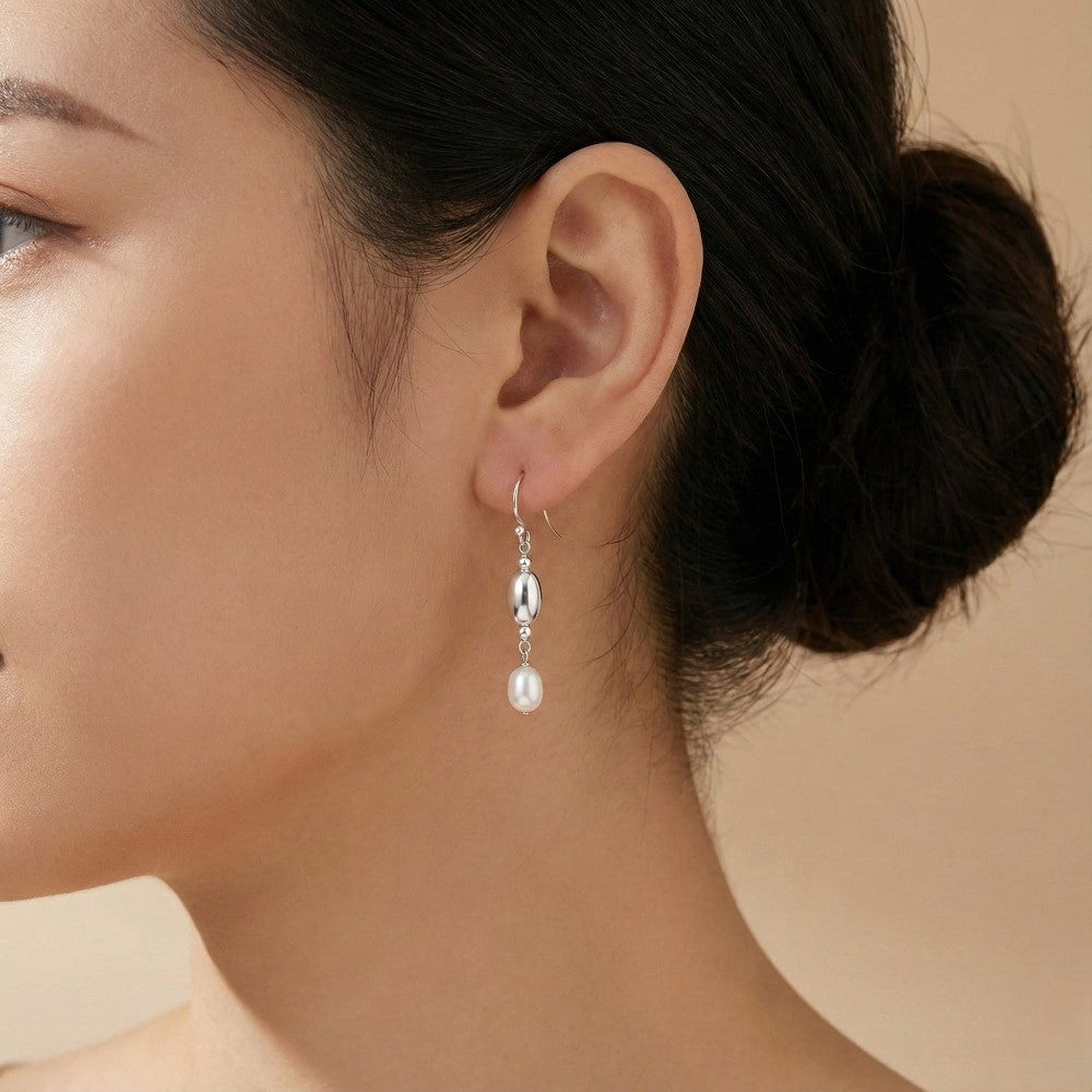 Αυτά τα κομψά σκουλαρίκια από ασήμι 925 είναι ιδανικά για να προσθέσετε μια πινελιά διακριτικής λάμψης στην καθημερινότητά σας. Διαθέτουν δύο οβάλ μαργαριτάρια γλυκού νερού (5-5.5mm) που κρέμονται από μια λεπτή αλυσίδα με μικρές ασημένιες μπάλες, δημιουργώντας μια graceful και minimal εμφάνιση. Η επιπλατίνωση ροδίου εξασφαλίζει την ανθεκτικότητα και τη λάμψη των σκουλαρικιών.