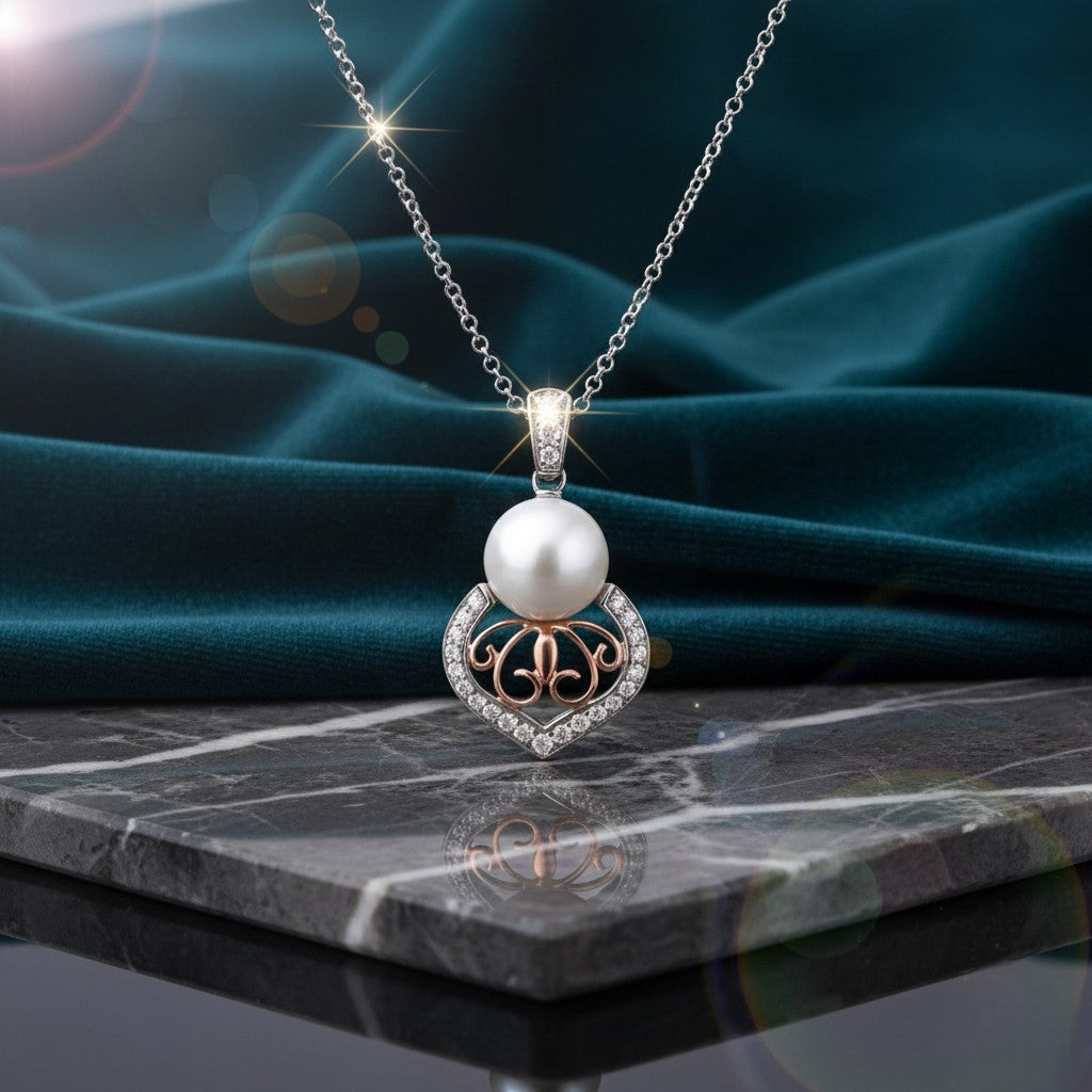 Αναδείξτε την κομψότητα και τη διαχρονική σας γοητεία με αυτό το εκλεπτυσμένο κολιέ από ασήμι 925. Το σχέδιο περιλαμβάνει ένα εντυπωσιακό μαργαριτάρι γλυκού νερού (9.5-10mm), τοποθετημένο σε μια κομψή ασημένια βάση διακοσμημένη με λαμπερό ζιργκόν, χαρίζοντας μια αίσθηση πολυτέλειας και φινέτσας. Η επιχρύσωση με ροζ χρυσό προσδίδει μια ζεστή και ρομαντική απόχρωση. Η αλυσίδα από ασήμι 925, επίσης επιχρυσωμένη με ροζ χρυσό, ολοκληρώνει το κομψό σύνολο.