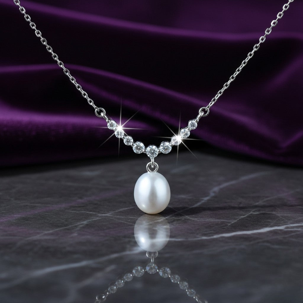 Αναδείξτε την κομψότητα και τη διαχρονική σας γοητεία με αυτό το εκλεπτυσμένο κολιέ από ασήμι 925. Το σχέδιο περιλαμβάνει ένα εντυπωσιακό οβάλ μαργαριτάρι γλυκού νερού (7.5-8mm), τοποθετημένο σε μια κομψή ασημένια βάση διακοσμημένη με μια σειρά από λαμπερά ζιργκόν, χαρίζοντας μια αίσθηση πολυτέλειας και φινέτσας. Η επιπλατίνωση ροδίου προσδίδει λάμψη και ανθεκτικότητα. Η αλυσίδα από ασήμι 925, επίσης επιπλατινωμένη με ρόδιο, ολοκληρώνει το κομψό σύνολο.