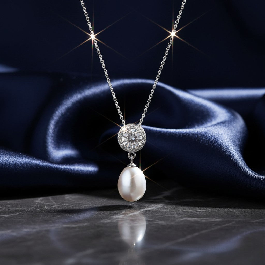 Ασημένιο 925 Κολιέ με Οβάλ Μαργαριτάρι Γλυκού Νερού & Ζιργκόν, επιπλατινωμένο με ρόδιο