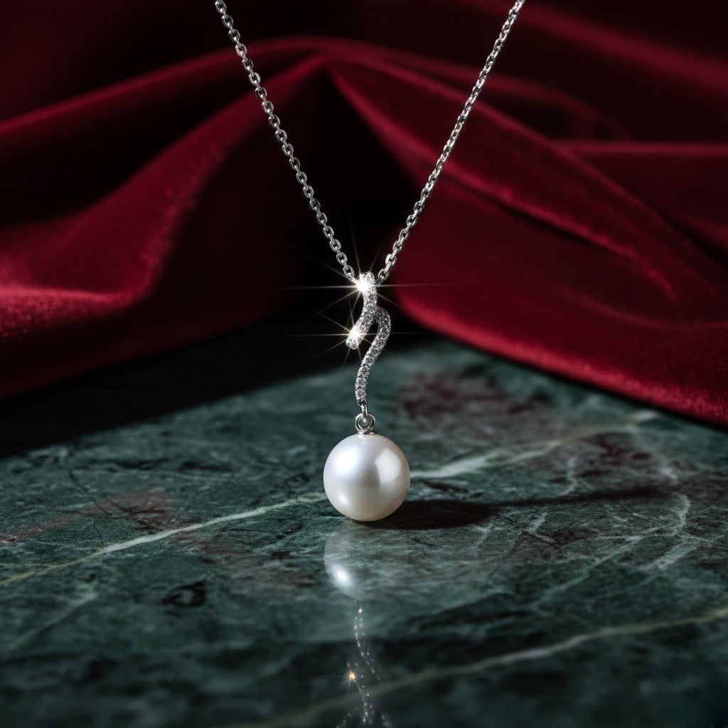 Αναδείξτε την κομψότητα και τη διαχρονική σας γοητεία με αυτό το εκλεπτυσμένο κολιέ από ασήμι 925. Το σχέδιο περιλαμβάνει ένα εντυπωσιακό μαργαριτάρι γλυκού νερού (8.5-9mm) σε σχήμα σταγόνας, τοποθετημένο σε μια κομψή ασημένια βάση διακοσμημένη με λαμπερό ζιργκόν, χαρίζοντας μια αίσθηση πολυτέλειας και φινέτσας. Η επιπλατίνωση ροδίου προσδίδει λάμψη και ανθεκτικότητα. Η αλυσίδα από ασήμι 925, επίσης επιπλατινωμένη με ρόδιο, ολοκληρώνει το κομψό σύνολο.