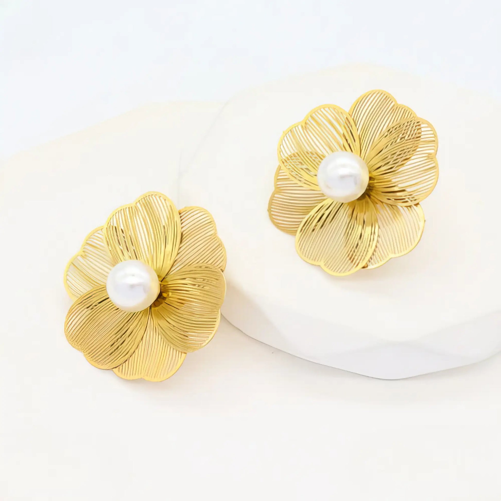 Αέρινα σκουλαρίκια σε σχέδιο λουλουδιού με μαργαριταρένια λεπτομέρεια στο κέντρο. Τέλεια για ρομαντικά looks.