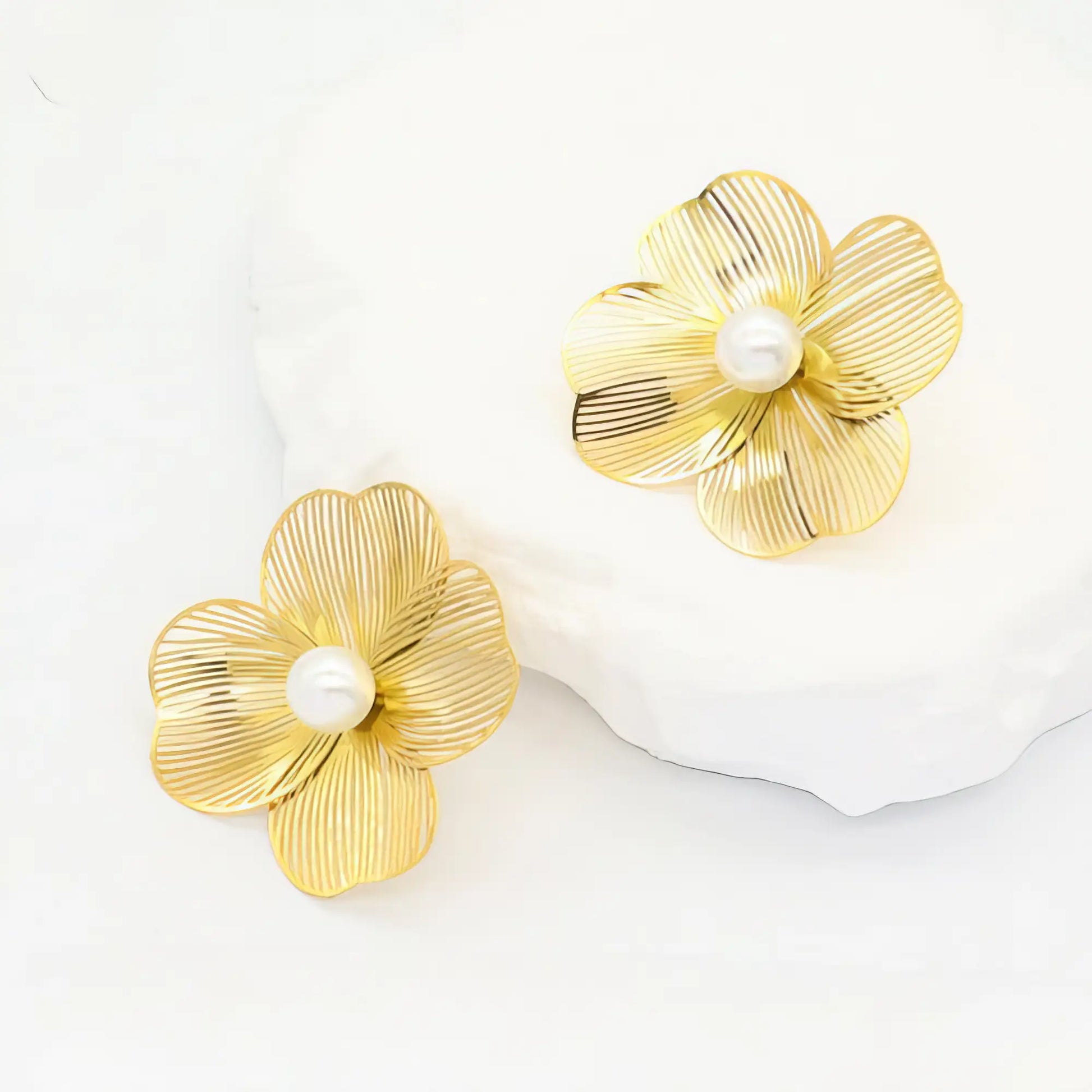Αέρινα σκουλαρίκια σε σχέδιο λουλουδιού με μαργαριταρένια λεπτομέρεια στο κέντρο. Τέλεια για ρομαντικά looks.