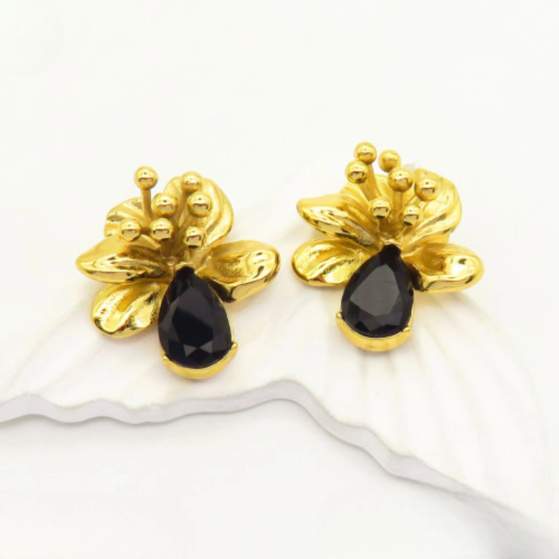 Εντυπωσιακά και ξεχωριστά σκουλαρίκια από ανοξείδωτο ατσάλι, σε χρυσό χρώμα με μαύρη δάκρυ-πέτρα και ανάγλυφο λουλουδένιο σχέδιο. Ιδανικά για ιδιαίτερες εμφανίσεις που θέλουν να ξεχωρίσουν με στιλ και φινέτσα.