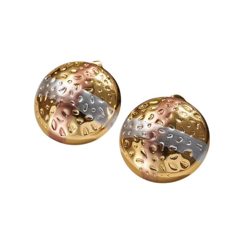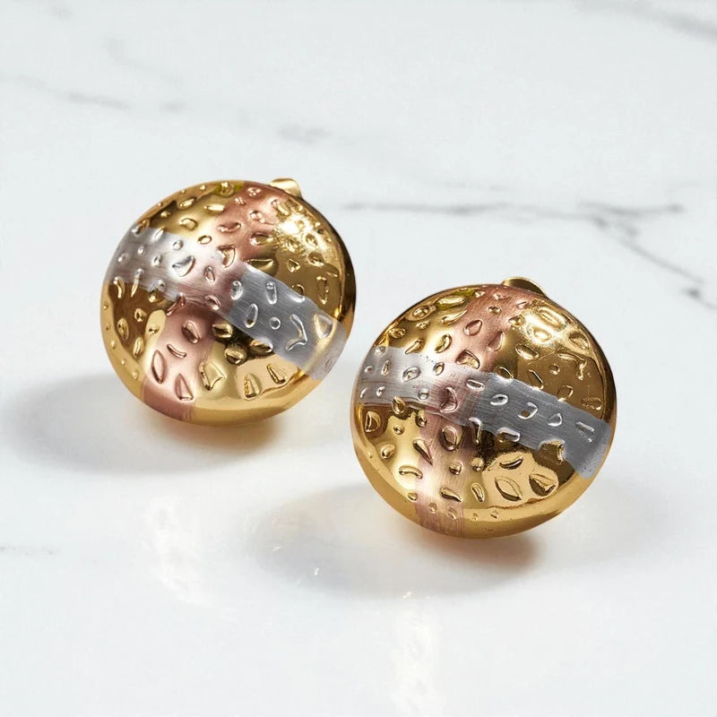 Εντυπωσιακά σκουλαρίκια από ανοξείδωτο ατσάλι με στρογγυλό σχήμα και μοναδική ανάγλυφη υφή. Ο τρίχρωμος σχεδιασμός σε αποχρώσεις χρυσού, ροζ χρυσού και ασημί τα καθιστά ιδανικά για μοντέρνες εμφανίσεις με προσωπικότητα.