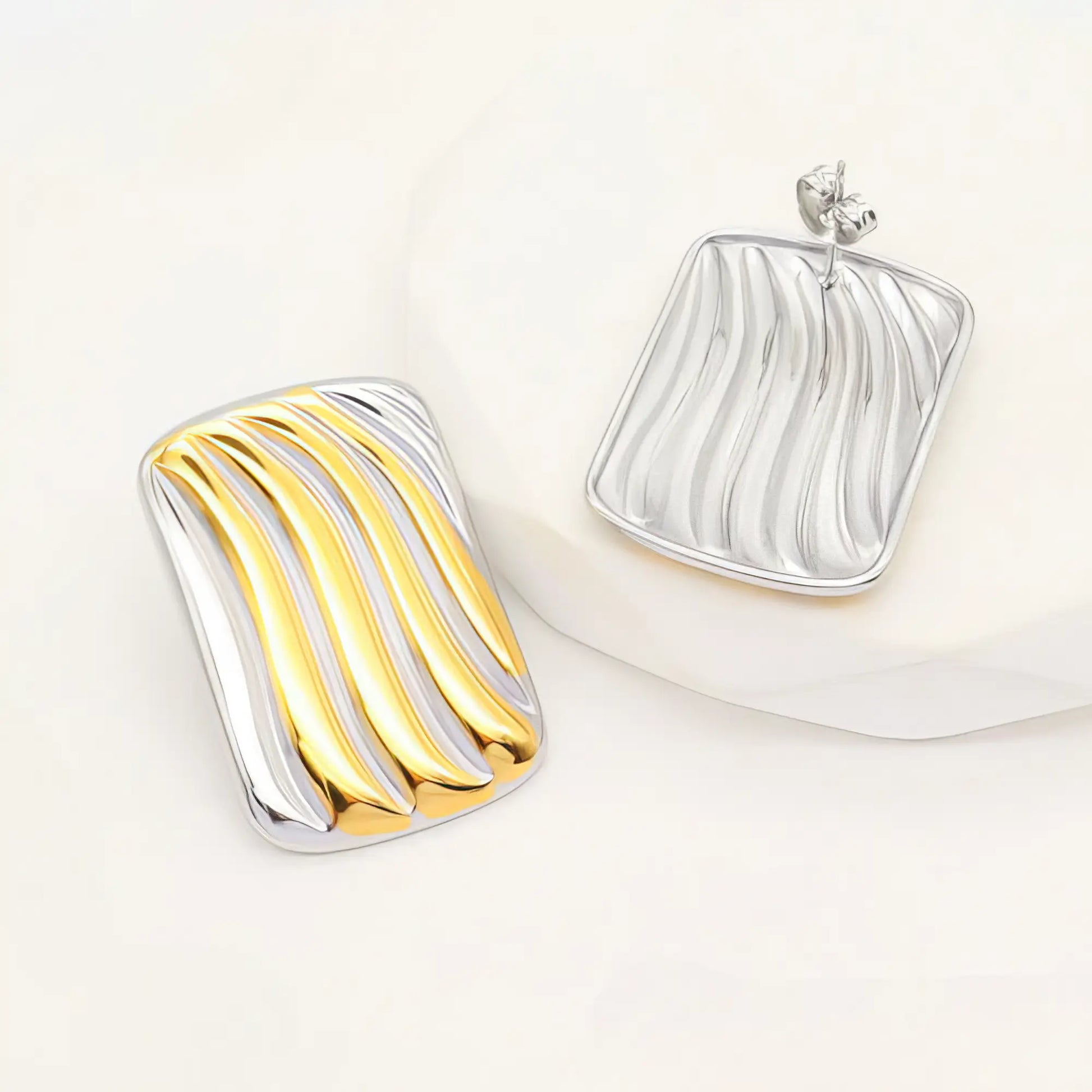 Εντυπωσιακά σκουλαρίκια σε ορθογώνιο σχήμα με κυματιστή υφή σε χρυσό & ασημί τόνο. Ένα ultra modern σχέδιο που ξεχωρίζει.