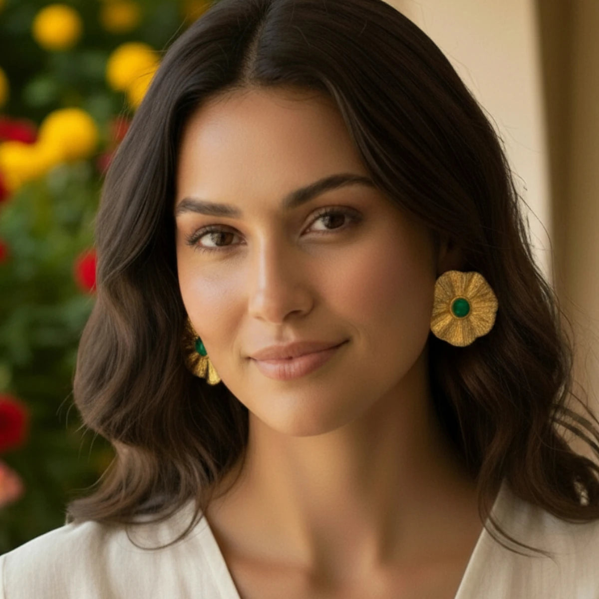 Χρυσά καρφωτά σκουλαρίκια σε σχήμα λουλουδιού, με ανάγλυφη υφή και πράσινη λαμπερή πέτρα στο κέντρο. Ένα εντυπωσιακό αλλά κομψό σχέδιο που συνδυάζει τη θηλυκότητα με μια δόση vintage αισθητικής.
