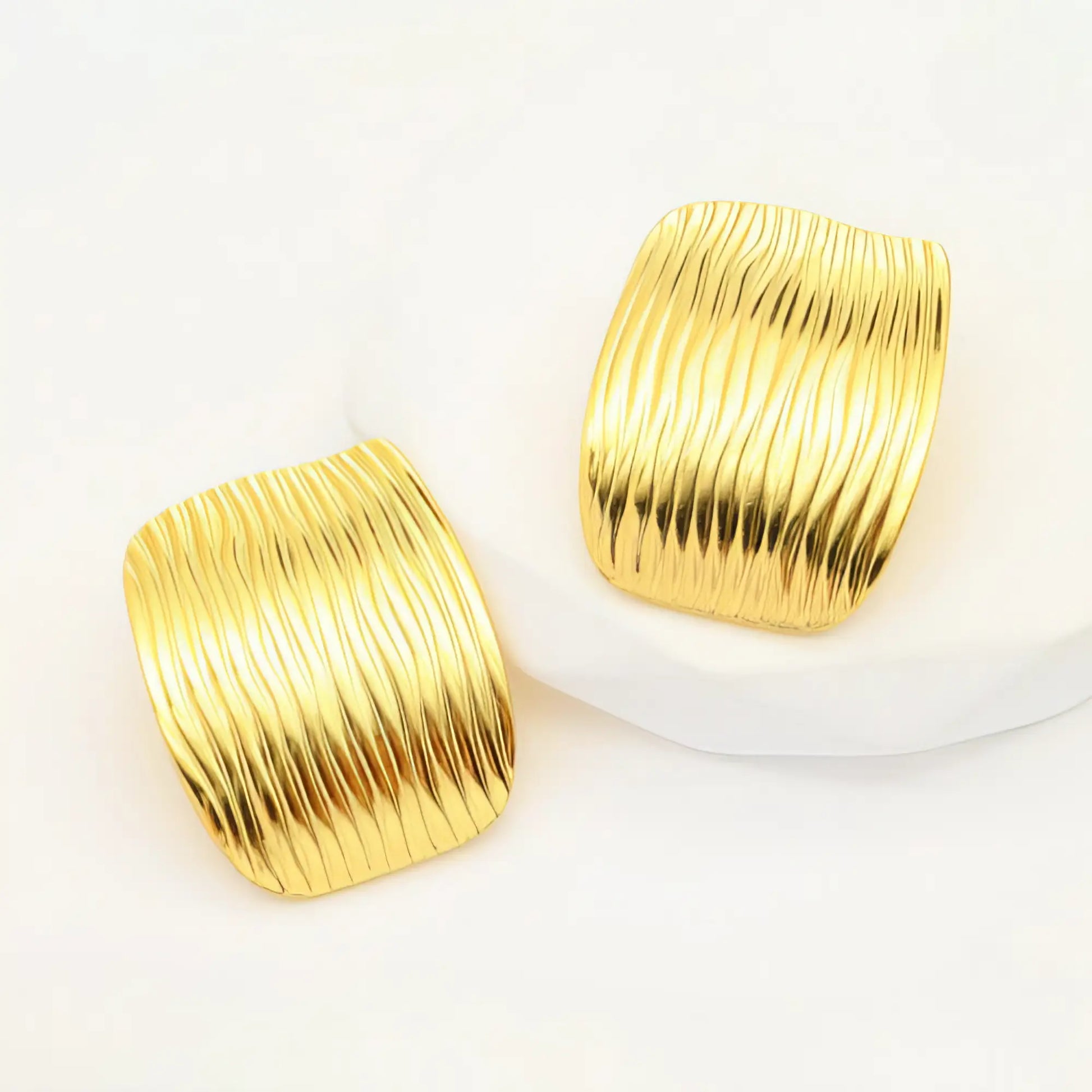 Minimal με καλλιτεχνική διάθεση, αυτά τα τετράγωνα χρυσά σκουλαρίκια με κυματιστή επιφάνεια απογειώνουν το look σας.