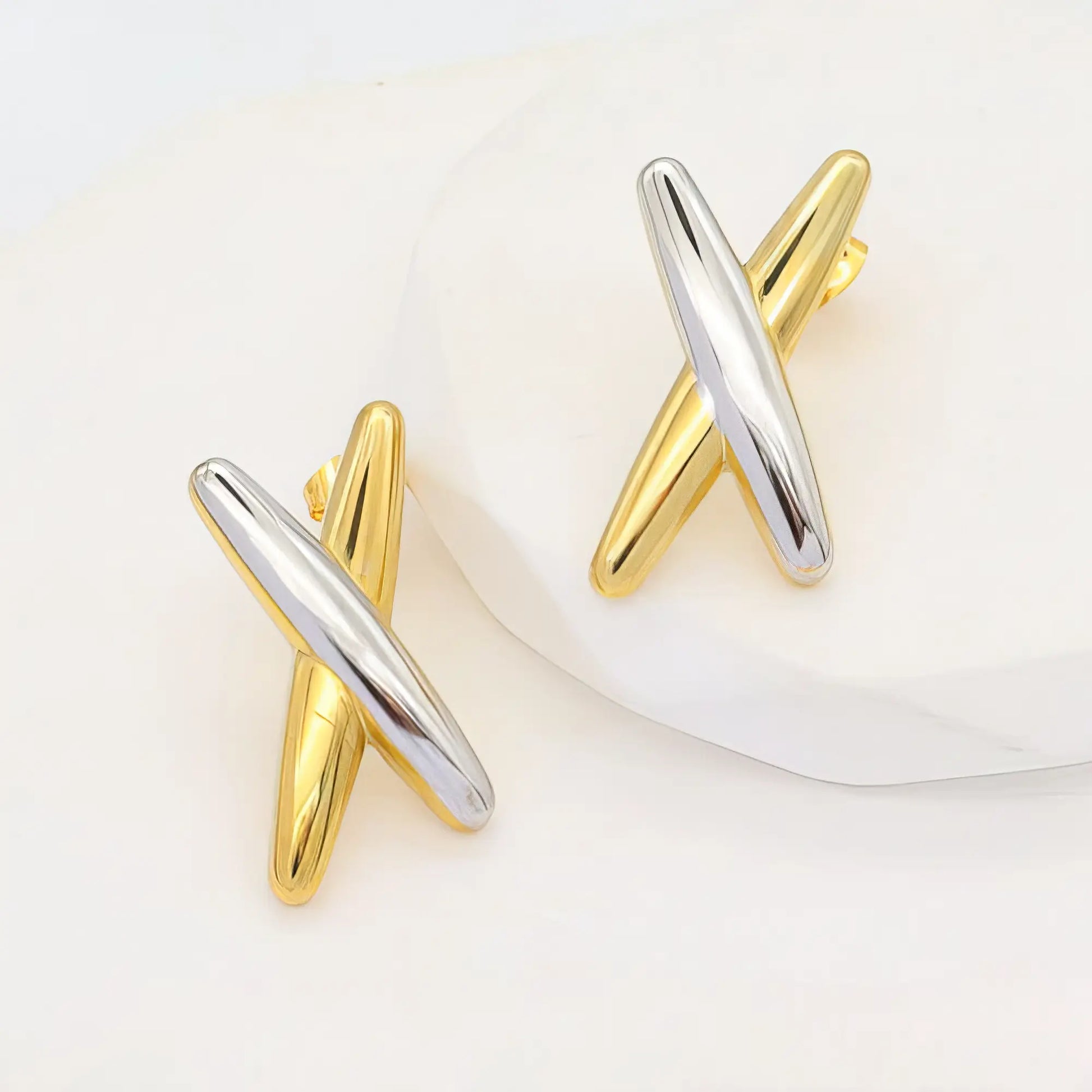 Μοντέρνα σκουλαρίκια από ανοξείδωτο ατσάλι σε διχρωμία χρυσού και ασημί. Ο εντυπωσιακός τους σχεδιασμός “X” χαρίζει urban chic στυλ που αναδεικνύει κάθε εμφάνιση.