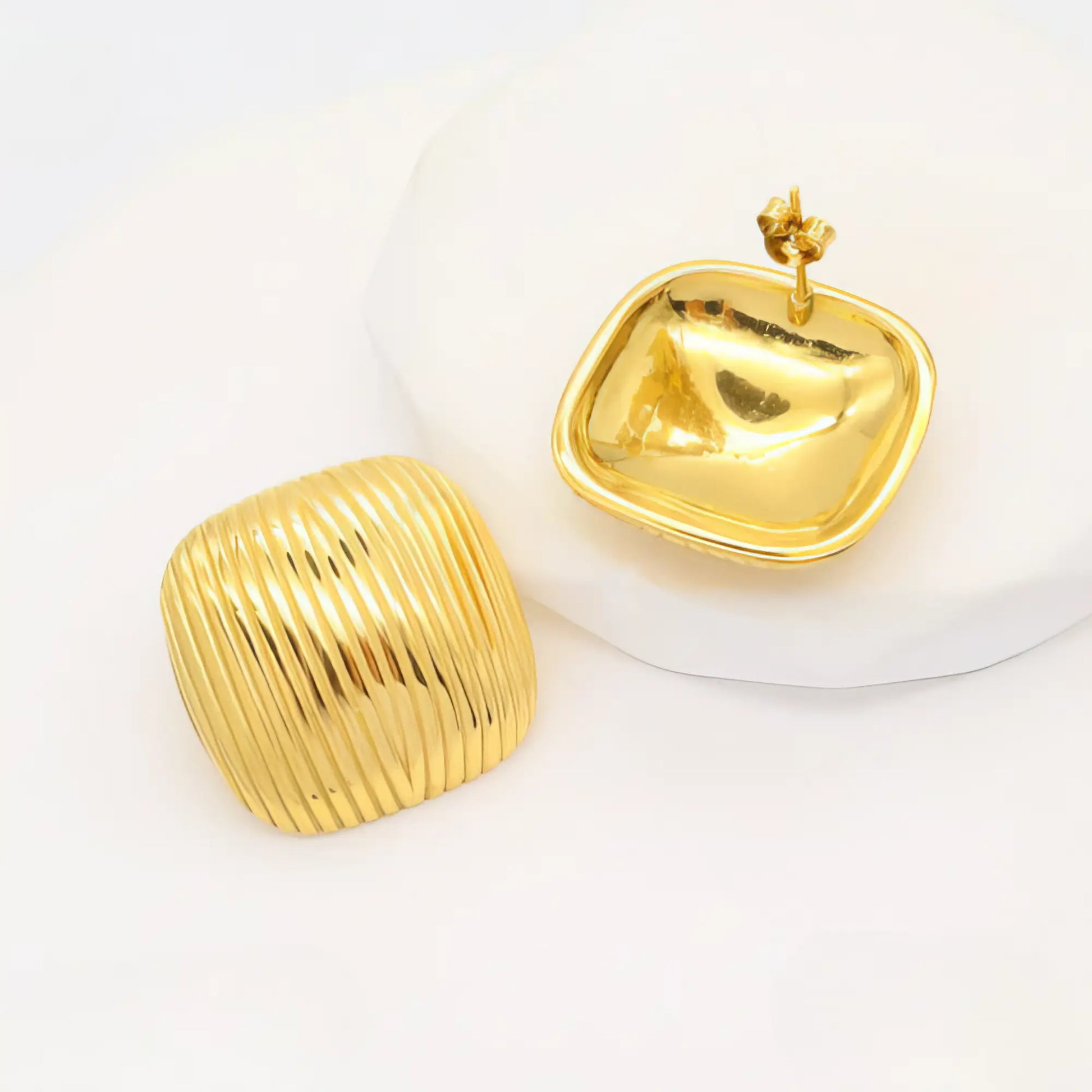 Minimal αλλά εντυπωσιακά, αυτά τα χρυσά σκουλαρίκια από ανοξείδωτο ατσάλι δίνουν στο look σας μοντέρνα δυναμική. Το τετράγωνο σχέδιο με ανάγλυφη υφή τα κάνει ιδανικά για elegant εμφανίσεις.