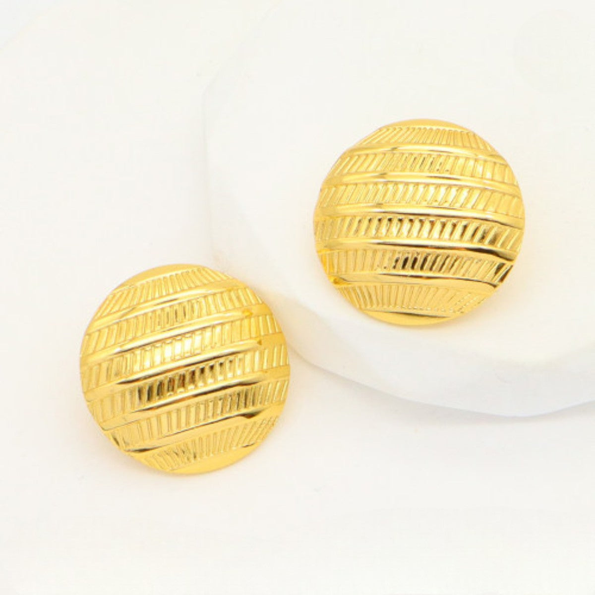 Αυτά τα elegant χρυσά σκουλαρίκια είναι η τέλεια επιλογή για γυναίκες που αγαπούν τη διαχρονική κομψότητα με μια μοντέρνα πινελιά. Η ανάγλυφη ριγέ υφή τους παίζει με το φως, δημιουργώντας ένα refined αποτέλεσμα που αναδεικνύει κάθε outfit. Ιδανικά για καθημερινές αλλά και βραδινές εμφανίσεις, συνδυάζονται άψογα με ένα sleek κολιέ ή χρυσό δαχτυλίδι. Ταιριάζουν ιδιαίτερα σε monochrome looks ή office chic στυλ.
