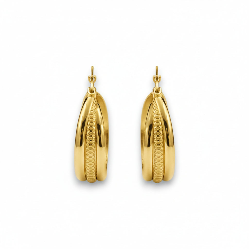 Κρίκοι σκουλαρίκια με διπλή καμπύλη και διακριτική ανάγλυφη λεπτομέρεια στο εσωτερικό μέρος. Το γυαλιστερό χρυσό φινίρισμα συνδυάζεται με την υφή, δημιουργώντας ένα πιο πλούσιο και ενδιαφέρον αποτέλεσμα από τον κλασικό λείο κρίκο. Κόσμημα με χαρακτήρα, χωρίς να γίνεται υπερβολικό.