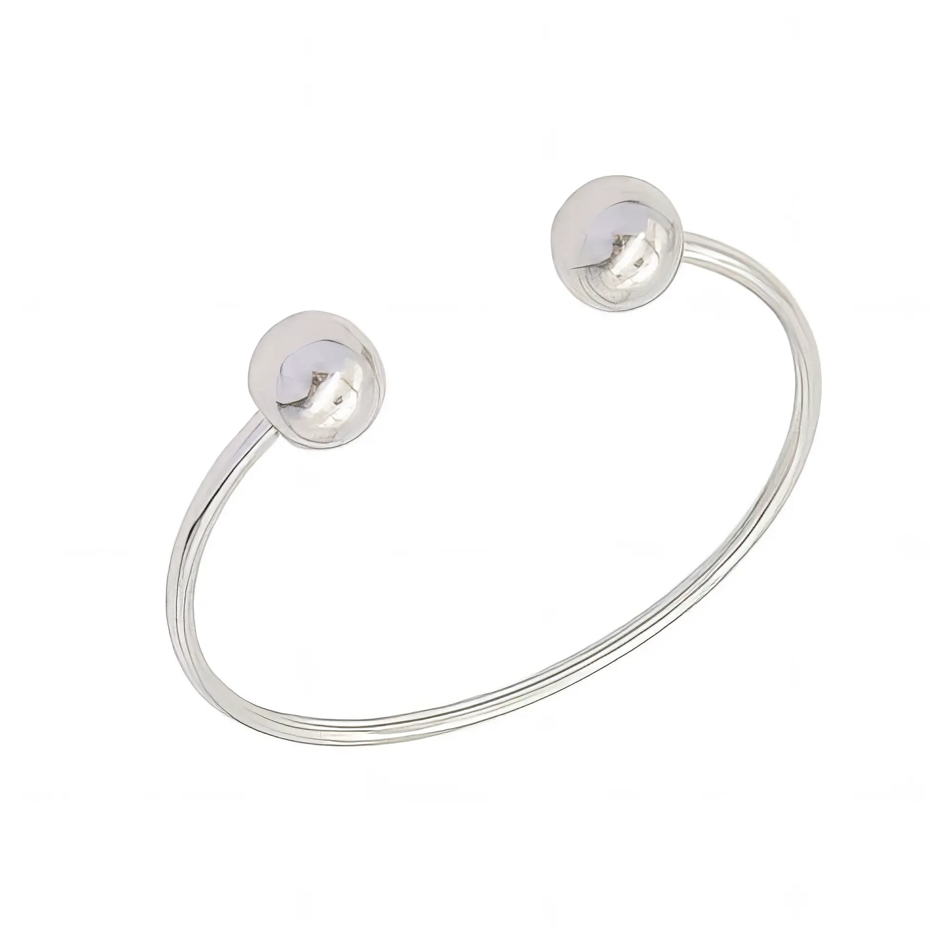 Στιλάτο ανοιχτό βραχιόλι σε ασημί απόχρωση, με δύο σφαιρικά τελειώματα. Ιδανικό για μοντέρνο αλλά διαχρονικό look.