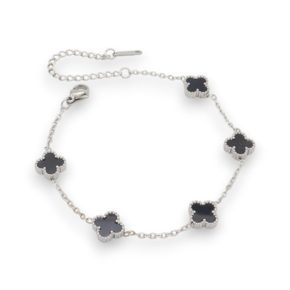 Ατσάλινο Ασημί Βραχιόλι με Μικρά Μαύρα Τετράφυλλα – 18 + 5 cm