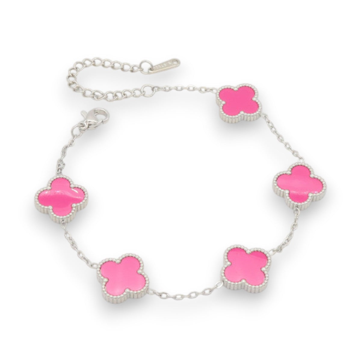Ατσάλινο Ασημί Βραχιόλι με Φούξια Τετράφυλλα (B3509)