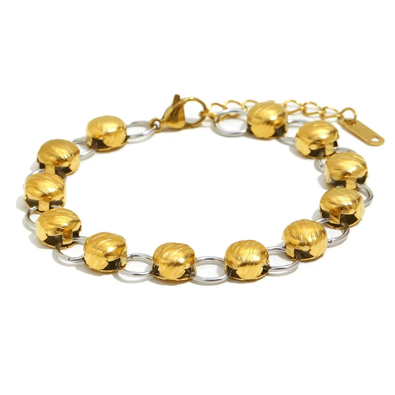 Ένα ξεχωριστό δίχρωμο ατσάλινο βραχιόλι που συνδυάζει χρυσές ανάγλυφες χάντρες με ασημί κρίκους δημιουργώντας ένα εντυπωσιακό, αλλά και κομψό αποτέλεσμα. Οι χάντρες έχουν ανάγλυφη υφή που αντανακλά το φως και δίνει στο κόσμημα πολυτελή και δυναμική εμφάνιση.