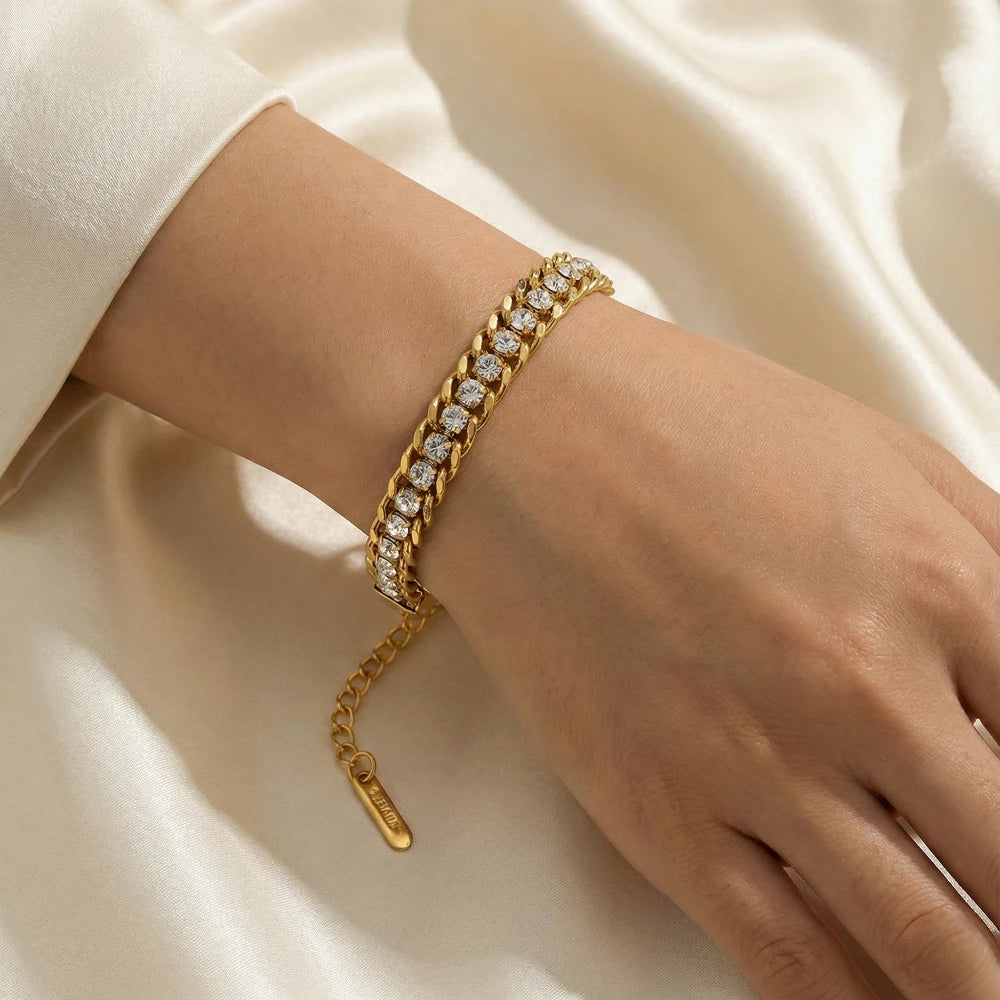 Ατσάλινο βραχιόλι με αλυσίδα & λευκά ζιργκόν – Χρυσό (B3499)