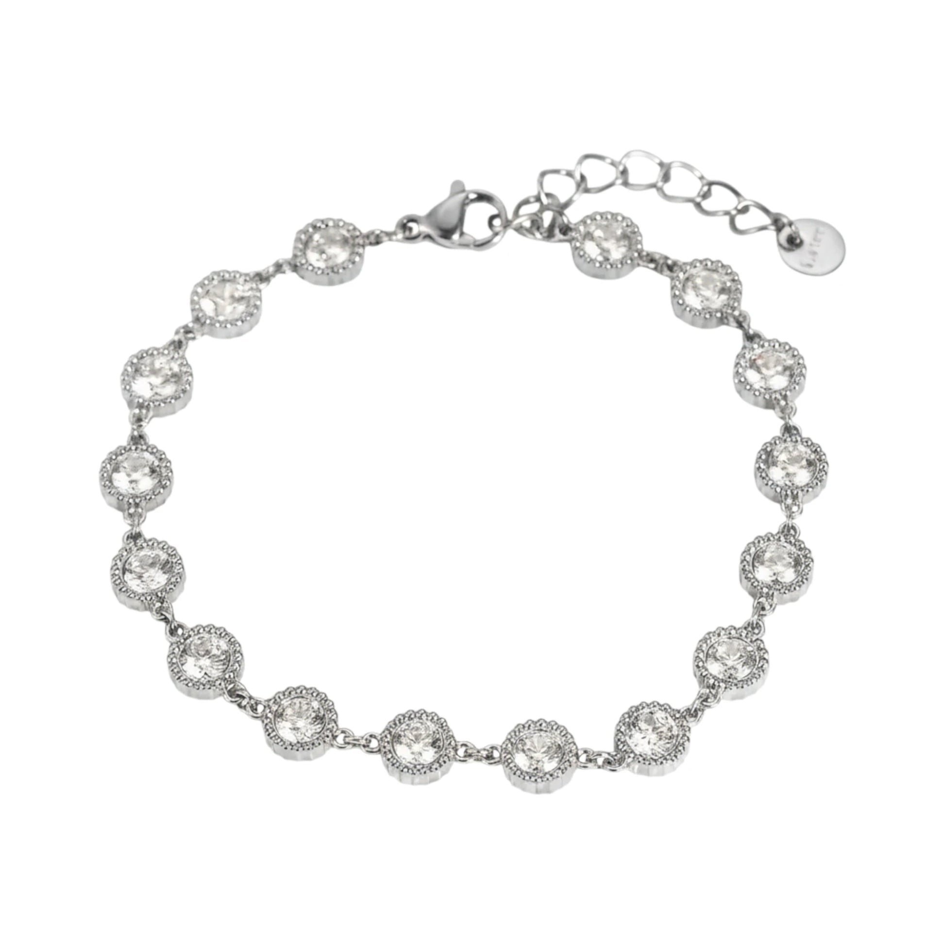 Κομψό και εντυπωσιακό βραχιόλι από ανοξείδωτο ατσάλι σε ασημί απόχρωση, διακοσμημένο με λαμπερές λευκές πέτρες τύπου ζιργκόν. Το διαχρονικό του σχέδιο χαρίζει λάμψη και θηλυκότητα σε κάθε σου εμφάνιση, είτε πρόκειται για καθημερινές στιγμές είτε για πιο ιδιαίτερες περιστάσεις. Διαθέτει ρυθμιζόμενο μήκος και πρακτικό κούμπωμα για άνετη εφαρμογή.
