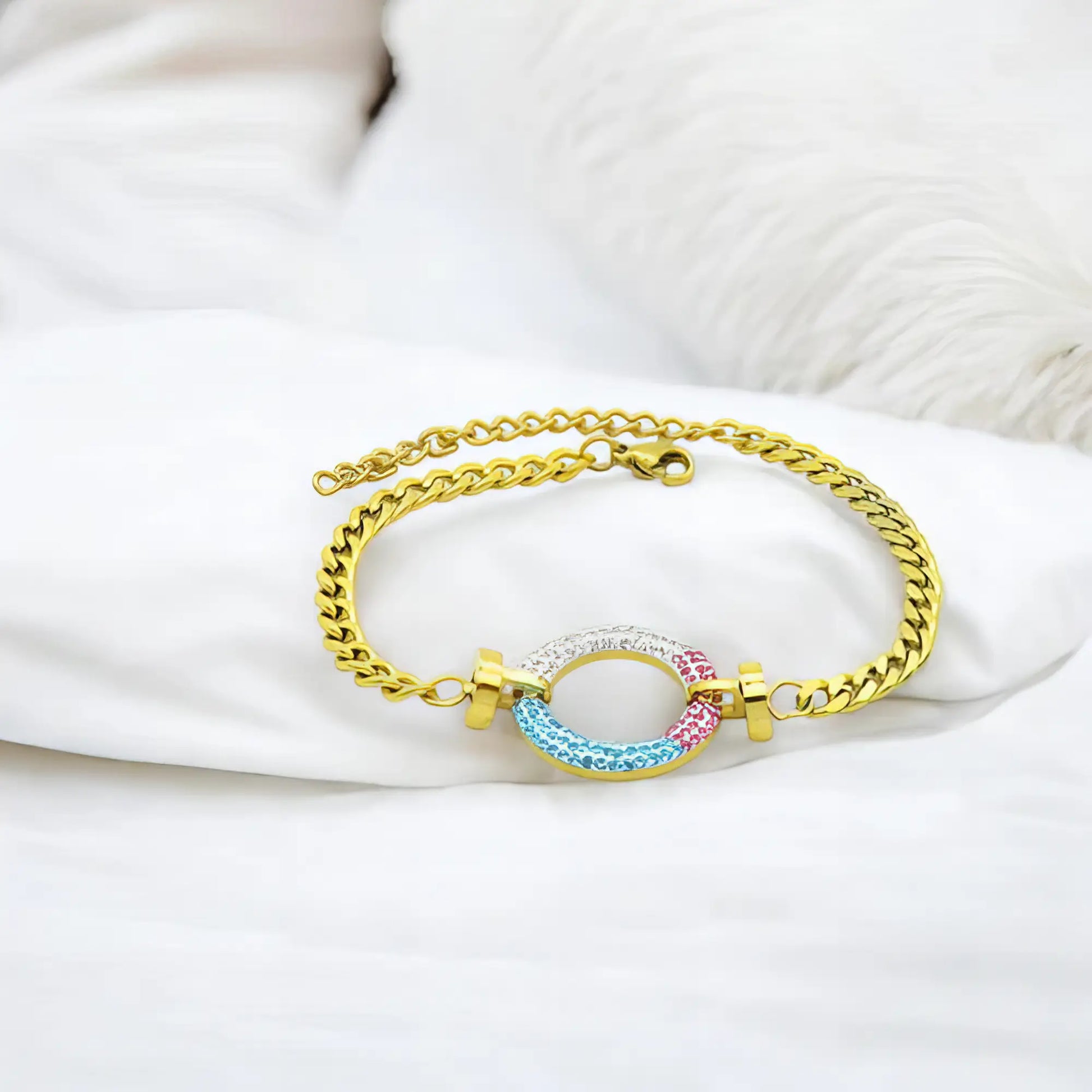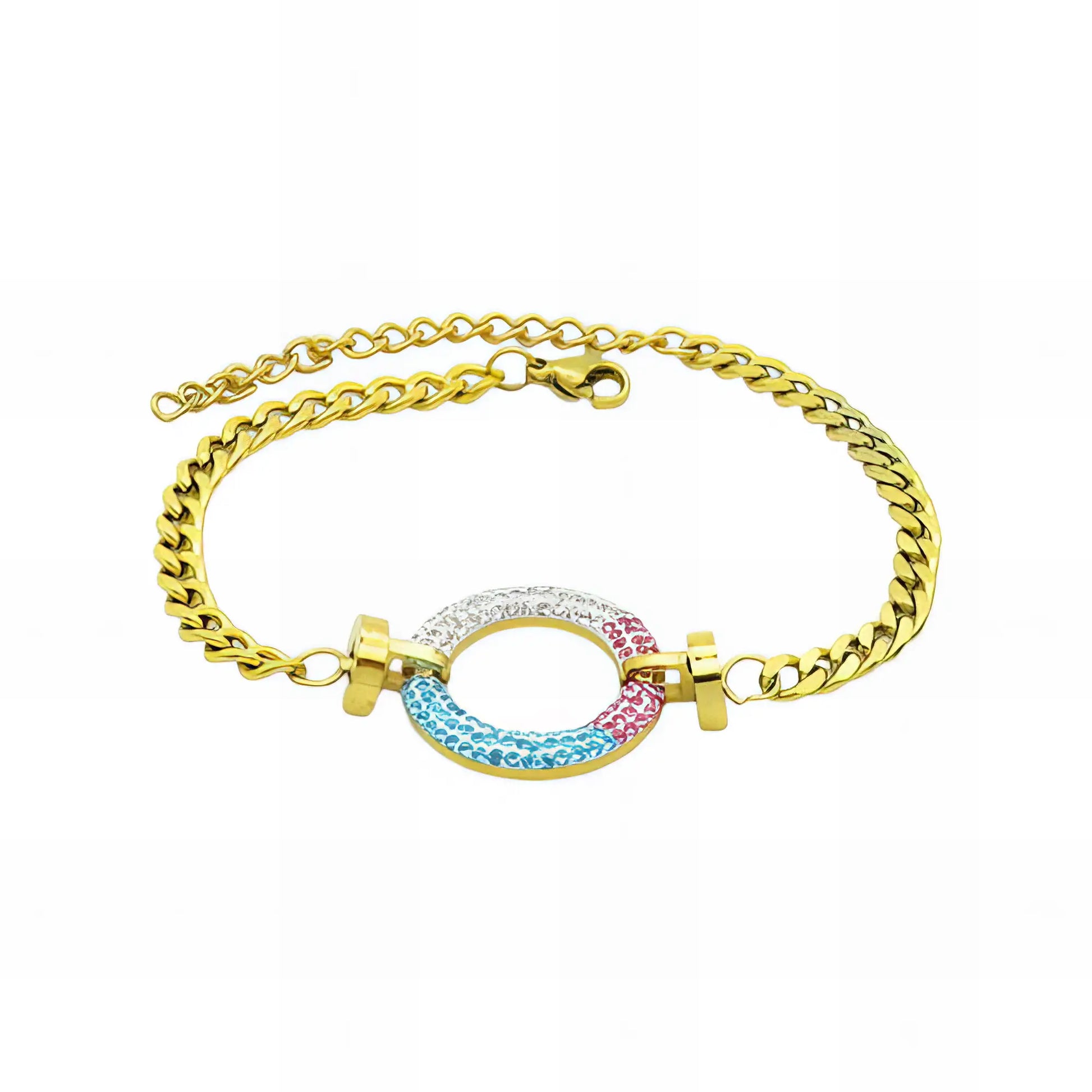 Ένα εντυπωσιακό ατσάλινο βραχιόλι με μοντέρνα αλυσίδα και κεντρικό κρίκο διακοσμημένο με λευκά, ροζ και γαλάζια ζιρκόν. Ο συνδυασμός των χρωμάτων δίνει ζωντάνια και κομψότητα, ενώ το χρυσό φινίρισμα προσθέτει μια elegant πινελιά που το κάνει ιδανικό για καθημερινή χρήση αλλά και βραδινές εμφανίσεις.