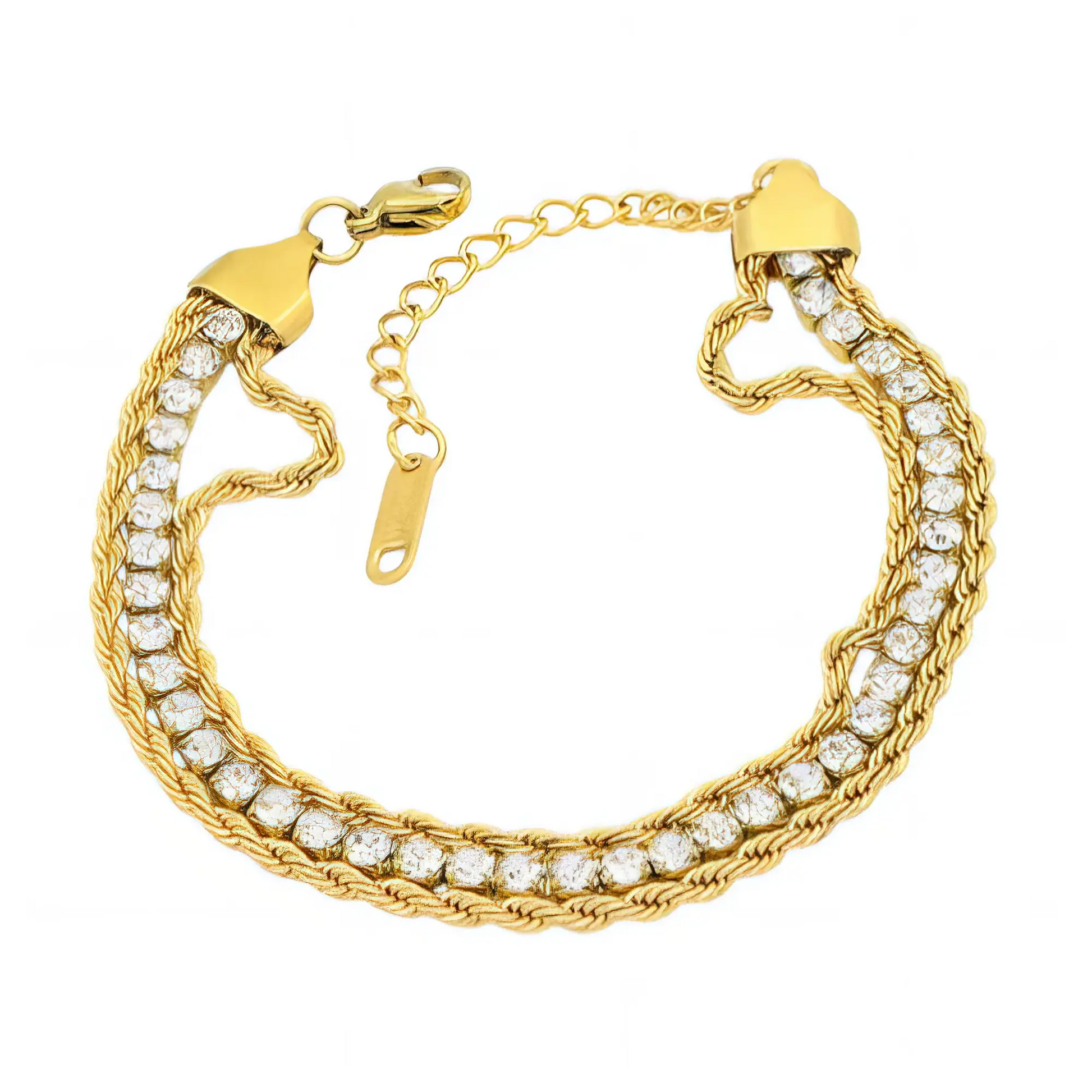 Εντυπωσιακό χρυσό βραχιόλι με λαμπερά λευκά ζιργκόν και στριφτή αλυσίδα. Μια διαχρονική επιλογή που δίνει λάμψη σε κάθε εμφάνιση.
