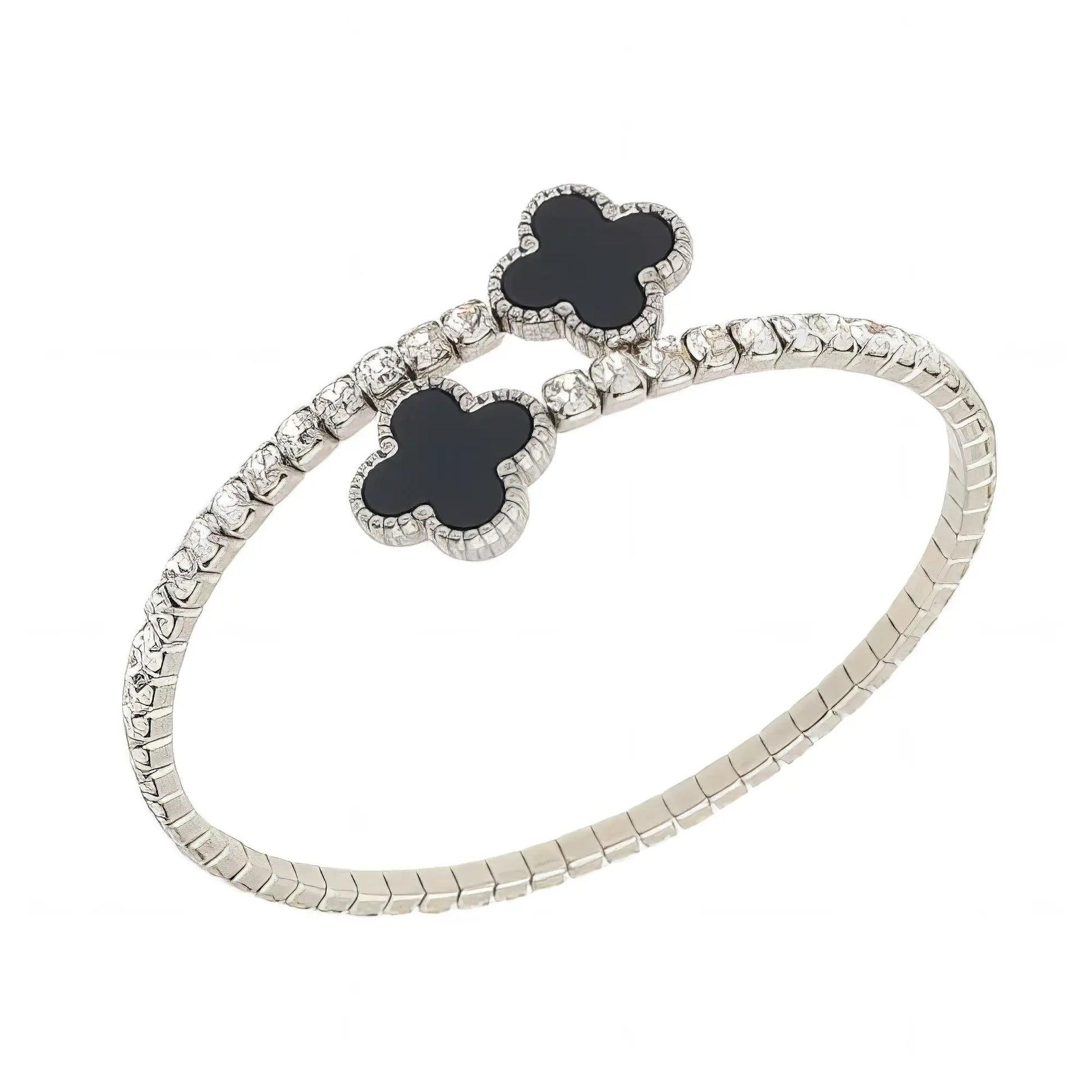 Ατσάλινο ελαστικό βραχιόλι με μαύρα τριφύλλια σε ασημί – 8.4g | 54x3mm