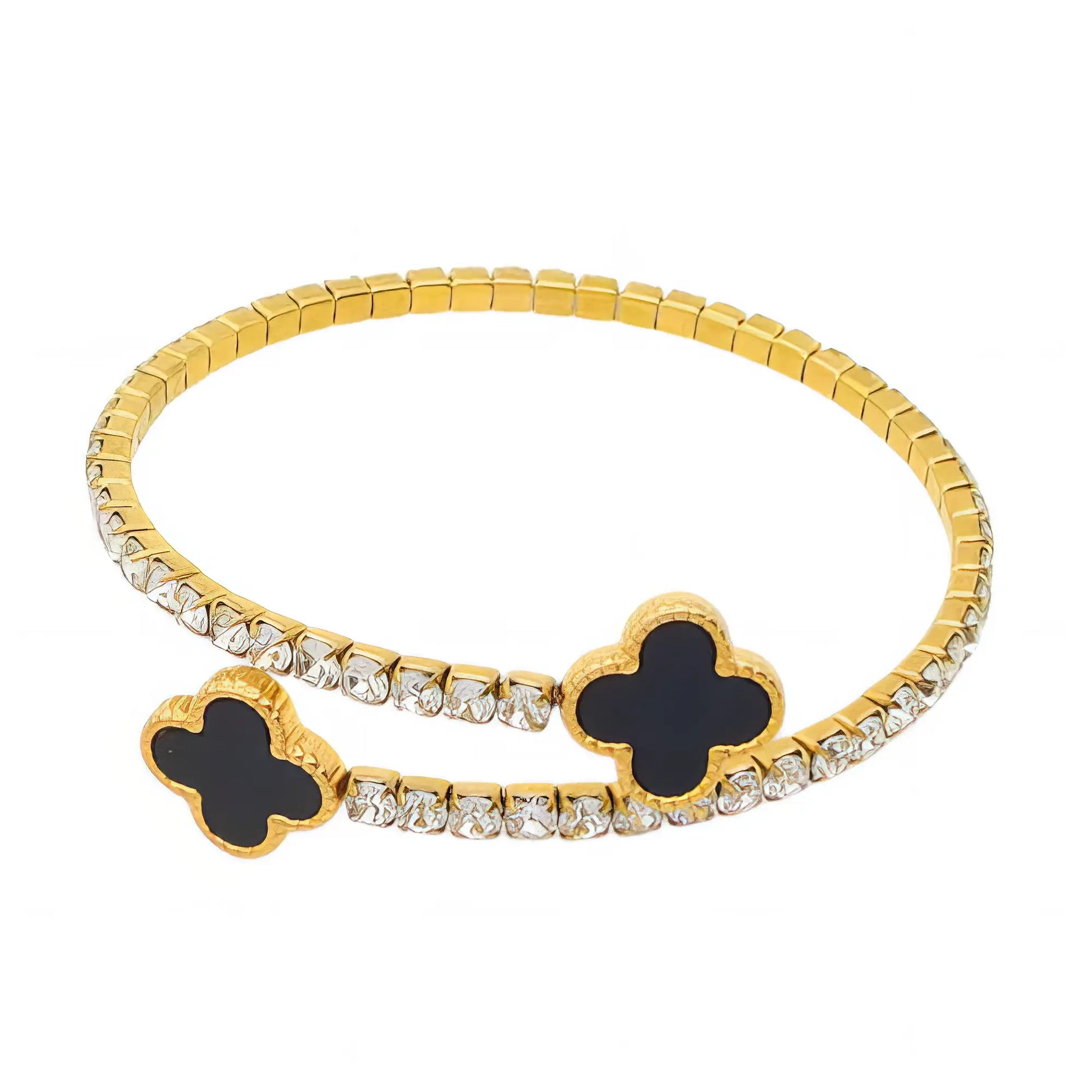 Χρυσό ελαστικό βραχιόλι με διπλό μαύρο τριφύλλι και λευκά στρας. Ιδανικό για ξεχωριστές εμφανίσεις.