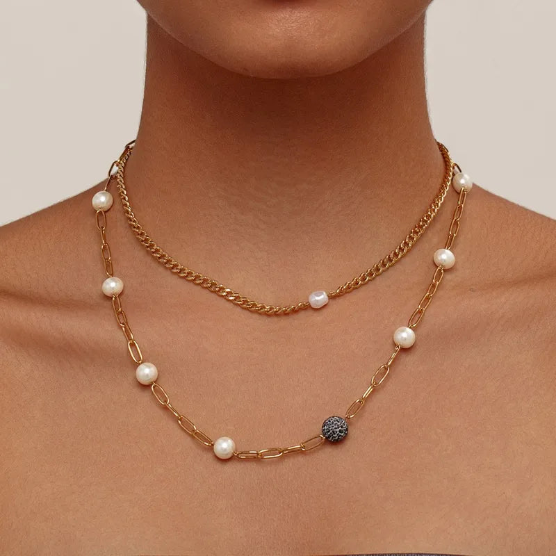 Ένα εντυπωσιακό και εξαιρετικά κομψό διπλό κολιέ, σχεδιασμένο για γυναίκες που αγαπούν την elegant εμφάνιση χωρίς υπερβολές. Η κοντή choker αλυσίδα προσθέτει μια διακριτική λάμψη γύρω από τον λαιμό, ενώ η δεύτερη αλυσίδα με τα οβάλ κρίκους και τα μαργαριτάρια δημιουργεί ένα πιο ρομαντικό και θηλυκό αποτέλεσμα.