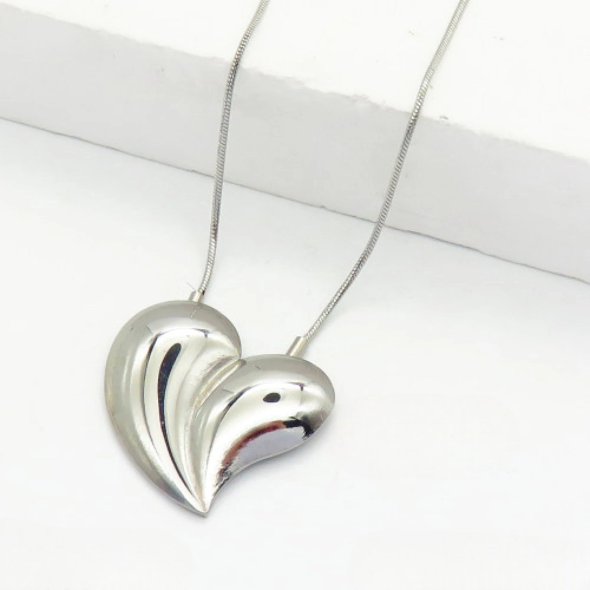 Κομψό και μοντέρνο κολιέ από ανοξείδωτο ατσάλι με γλυπτή καρδιά σε ασημί απόχρωση. Ένα διαχρονικό σχέδιο που αποπνέει ρομαντισμό και κομψότητα, ιδανικό για καθημερινές αλλά και πιο ξεχωριστές εμφανίσεις.