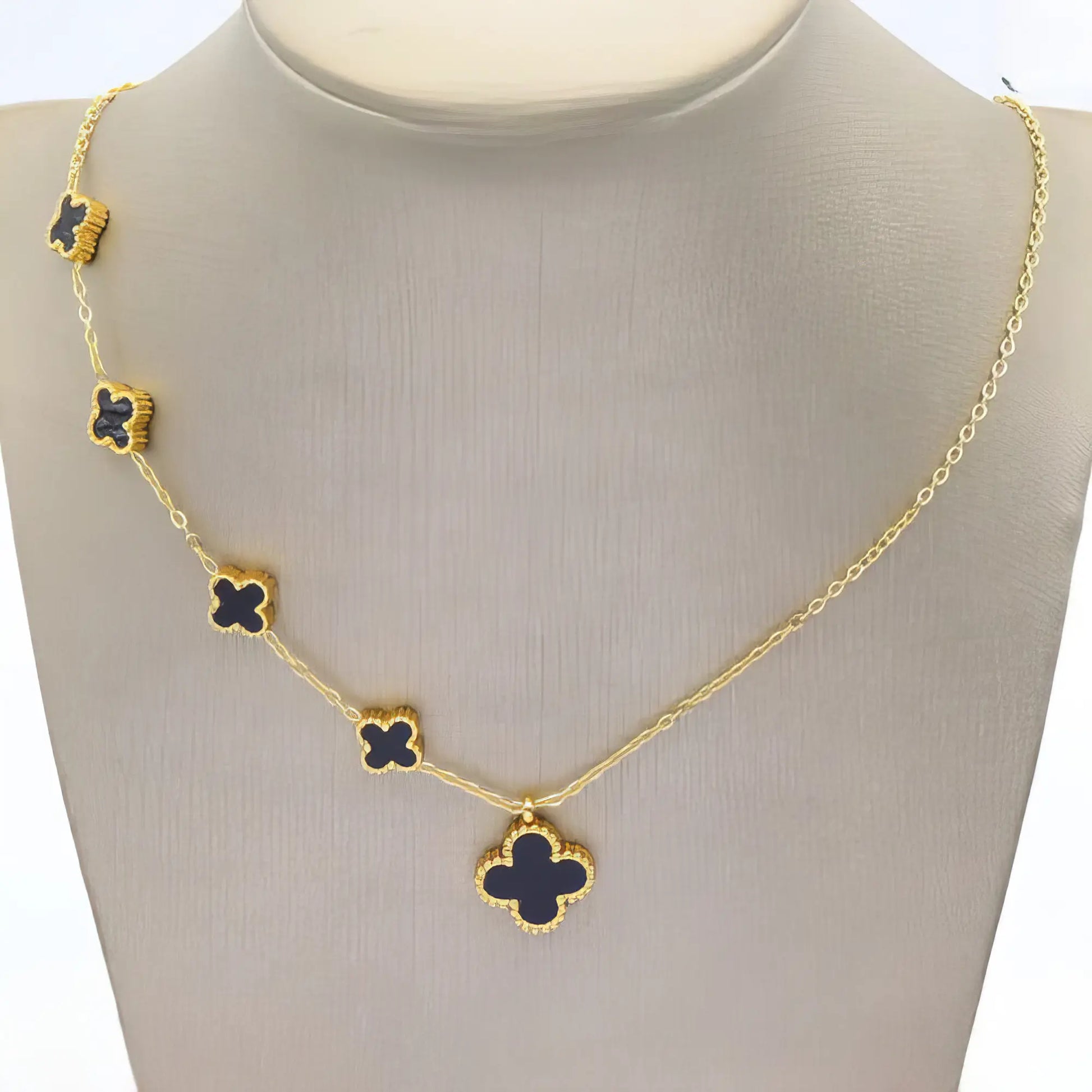 Ατσάλινο Κολιέ με Μαύρα Τετράφυλλα Μοτίφ και Επιχρύσωση 18K (N3312)
