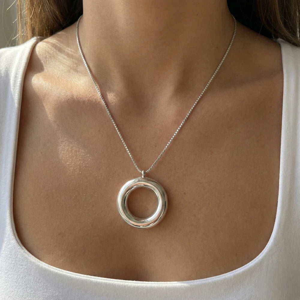 Μοντέρνο και statement, αυτό το ασημί κολιέ με μεγάλο στρογγυλό κρεμαστό είναι ένα κομμάτι που ξεχωρίζει. Το καθρέφτη φινίρισμά του χαρίζει πολυτέλεια και urban δυναμική, καθιστώντας το ιδανικό για minimal ή μονόχρωμα σύνολα. Μπορεί να φορεθεί μόνο του ως κεντρικό κόσμημα ή να συνδυαστεί με ασημί σκουλαρίκια κρίκους και λεπτό βραχιόλι για ολοκληρωμένο, σύγχρονο look.