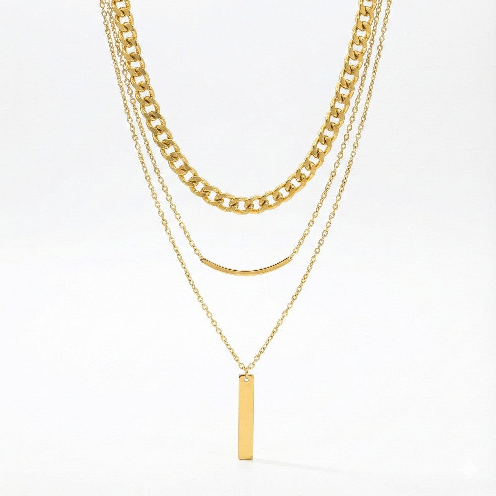 Ένα πλήρες layered necklace με τρεις διαφορετικές αλυσίδες. Η χοντρή αλυσίδα δίνει ένταση, η καμπύλη μπάρα προσθέτει κομψότητα, και το μακρύ στοιχείο χαρίζει ύψος και καθαρή γραμμή.