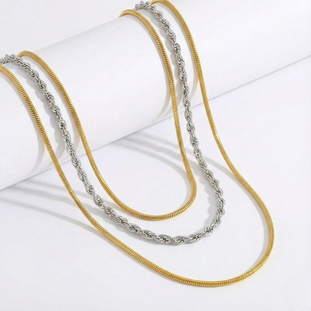 Ένα ιδιαίτερο, κομψό και παράλληλα statement κολιέ σε τρία επίπεδα, στη μοντέρνα δίχρωμη εκδοχή που συνδυάζει χρυσές και ασημί αλυσίδες. Ο αρμονικός συνδυασμός των διαφορετικών υφών, snake και twisted, δίνει ένα αποτέλεσμα που τραβάει το βλέμμα χωρίς υπερβολές. Είναι ιδανικό για γυναίκες που θέλουν ένα κόσμημα που στέκεται μόνο του αλλά ταιριάζει και με layering.