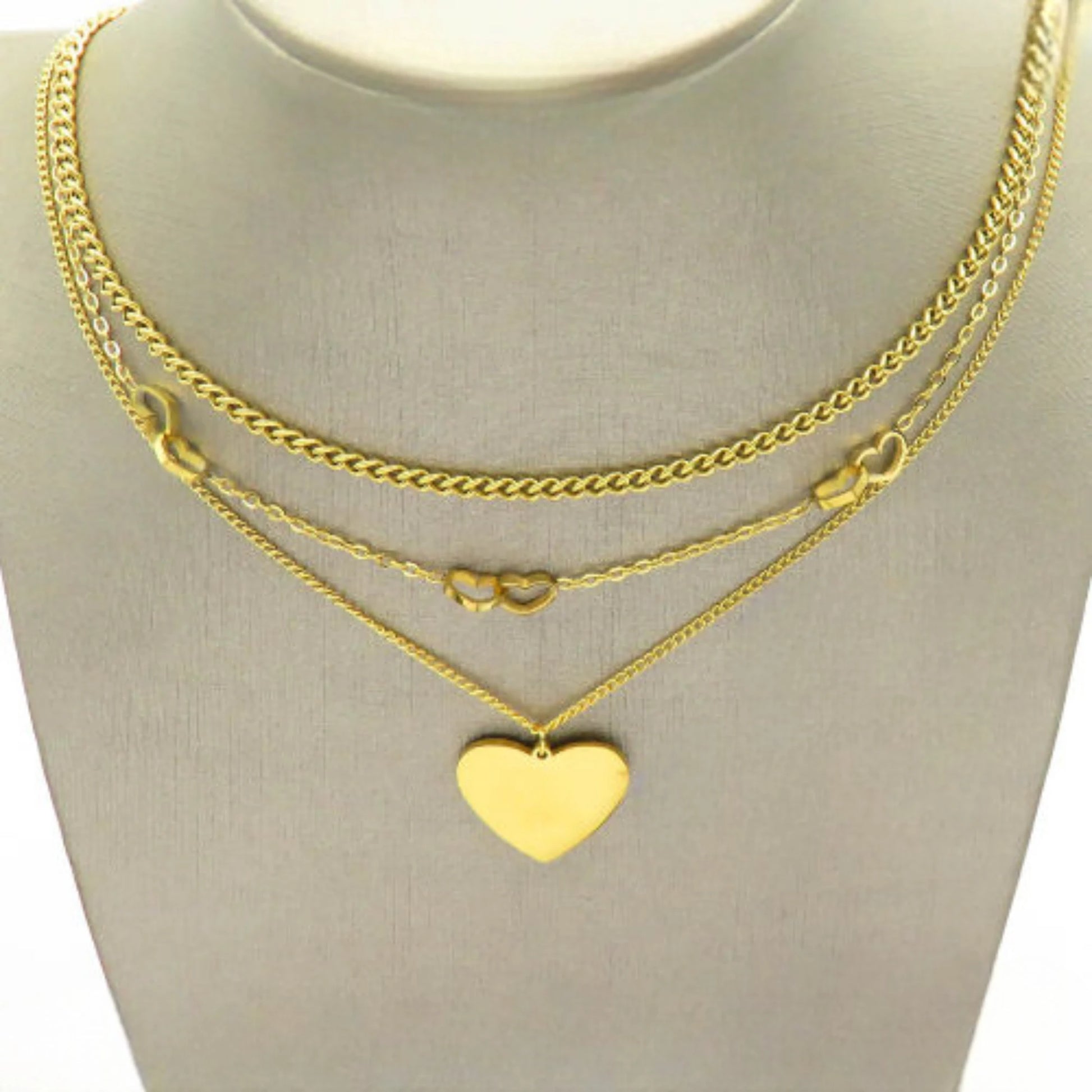 Κάνε κάθε σου εμφάνιση να ξεχωρίζει με αυτό το εντυπωσιακό τριπλό κολιέ από ανοξείδωτο ατσάλι σε χρυσή απόχρωση. Το layered design του με καρδιές σε διαφορετικά μεγέθη δημιουργεί ένα μοντέρνο και ρομαντικό αποτέλεσμα, ιδανικό για layering με άλλα κοσμήματα ή ως statement piece.