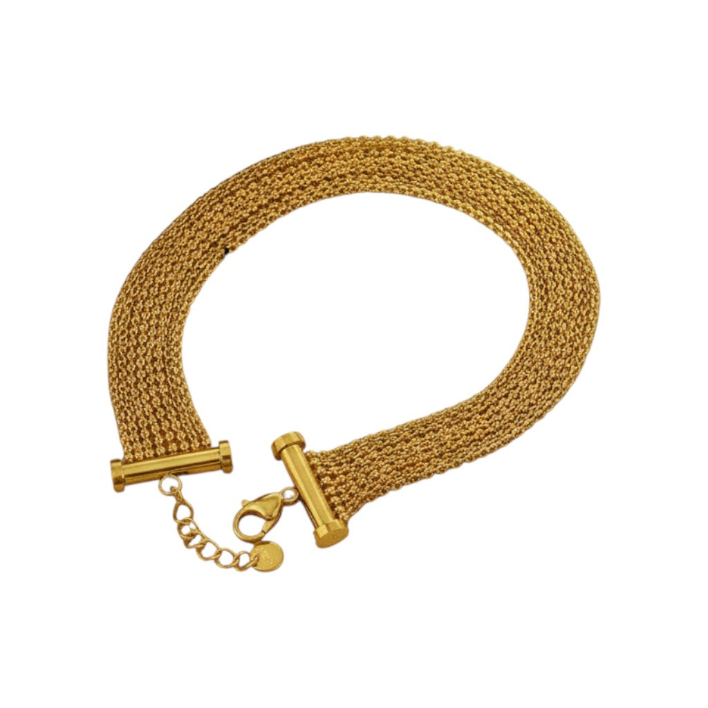 Ένα πολυτελές χρυσό βραχιόλι που ξεχωρίζει για τη λεπτοδουλεμένη πλέξη του και το διαχρονικά κομψό στυλ του. Η πολυστρωματική του μορφή χαρίζει ένταση και λάμψη στον καρπό, προσδίδοντας sophisticated χαρακτήρα σε κάθε εμφάνιση.