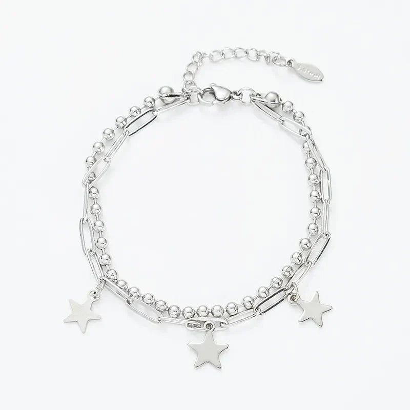 Βραχιόλι ατσάλινο με διπλή αλυσίδα με κρεμαστά αστέρια χρώμα ασημί