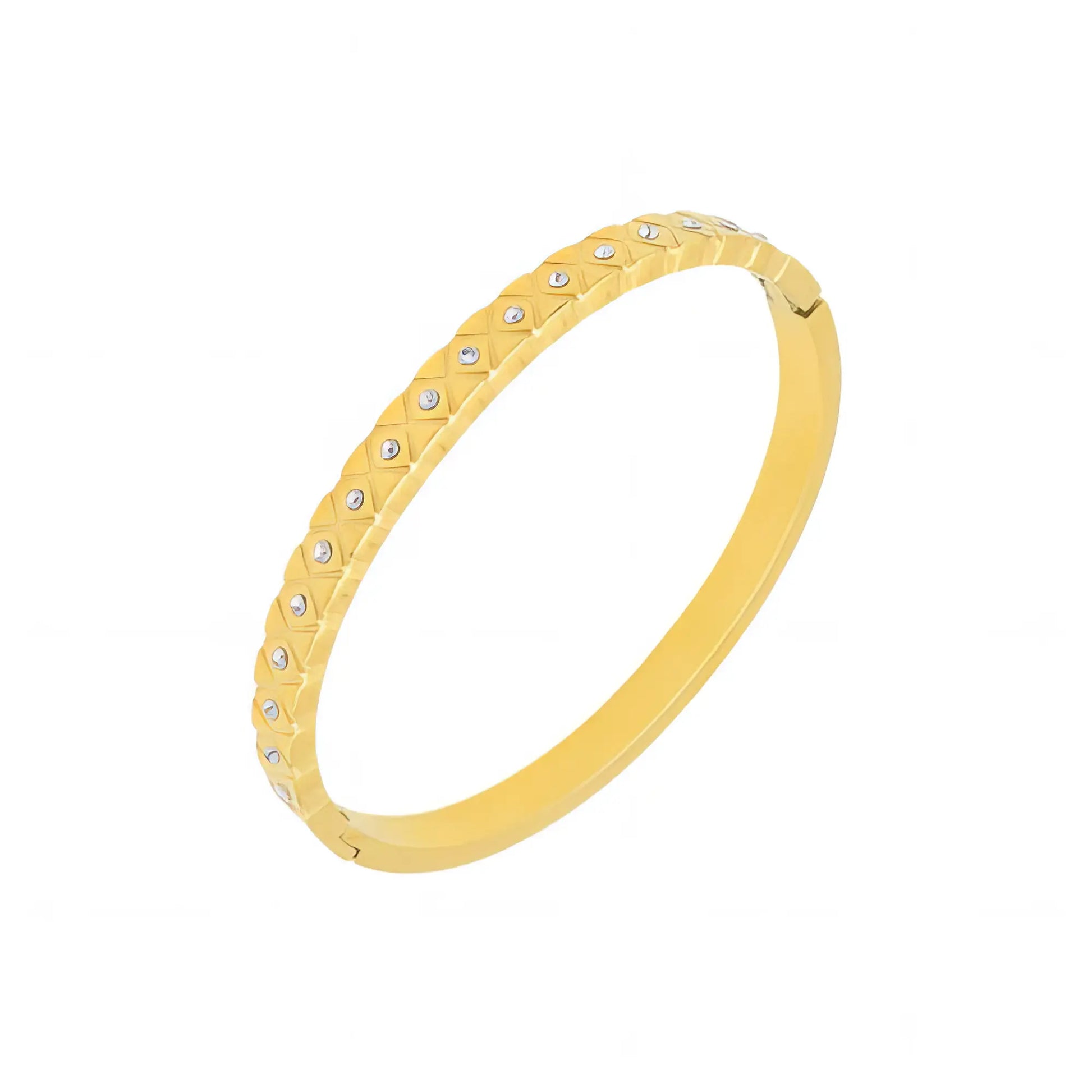Αναβαθμίστε το στυλ σας με αυτό το πολυτελές βραχιόλι χειροπέδα από ανοξείδωτο ατσάλι σε χρυσό χρώμα. Το διαμανταριστό σχέδιο διακοσμημένο με λευκά ζιργκόν χαρίζει έντονη λάμψη, ενώ η στιβαρή του κατασκευή το καθιστά ιδανικό για καθημερινή αλλά και βραδινή εμφάνιση.