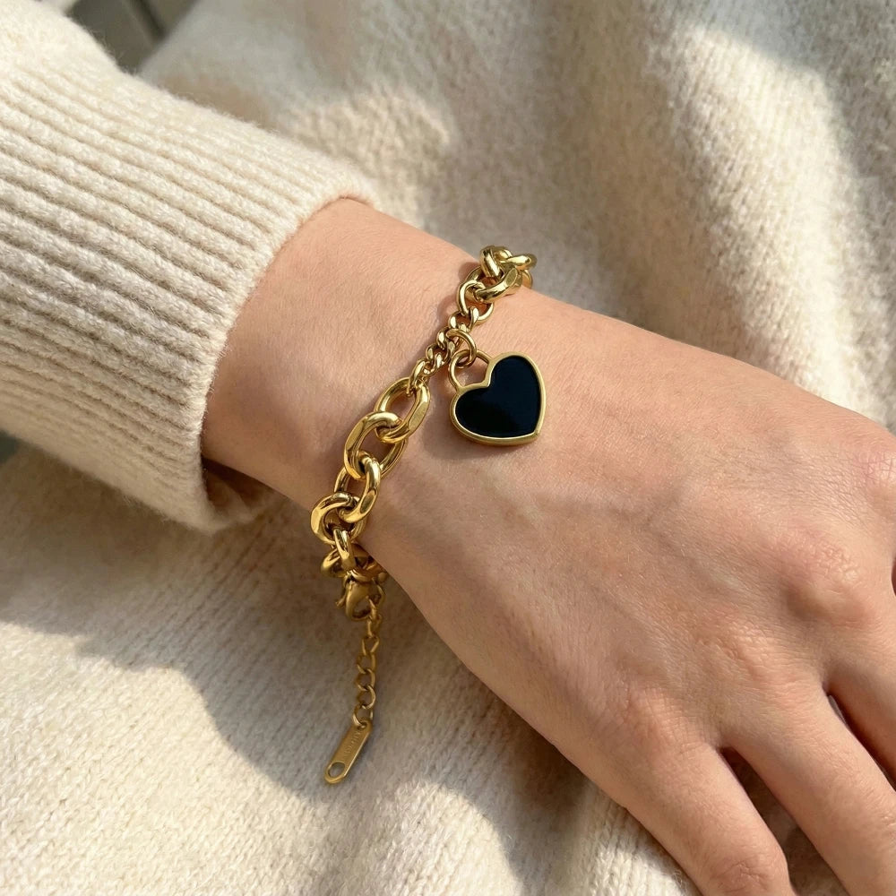 Αυτό το κομψό επιχρυσωμένο ατσάλινο διπλό βραχιόλι είναι ιδανικό για να προσθέσετε μια πινελιά ρομαντισμού και κομψότητας στην καθημερινότητά σας. Το βραχιόλι διαθέτει δύο λεπτές αλυσίδες, η μία με καρδιές από μαύρο σμάλτο και η άλλη με μικρές χρυσές μπίλιες, δημιουργώντας ένα εντυπωσιακό και διακριτικό αποτέλεσμα.