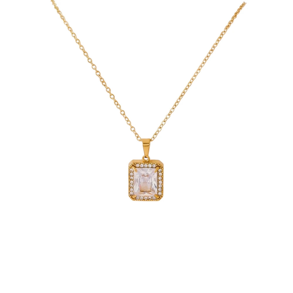Ένα λαμπερό και κομψό κολιέ που δίνει καθαρότητα και φινέτσα σε κάθε look. Η διάφανη πέτρα αντανακλά το φως όμορφα, ενώ το χρυσό πλαίσιο και οι μικρές ζιρκόν δημιουργούν ένα διακριτικό αλλά εντυπωσιακό αποτέλεσμα. Ταιριάζει σε κάθε περίσταση, από καθημερινές εμφανίσεις μέχρι πιο επίσημες στιγμές. Είναι ένα κόσμημα που δεν περνάει ποτέ απαρατήρητο και αποτελεί ιδανική επιλογή για layering με λεπτές αλυσίδες.