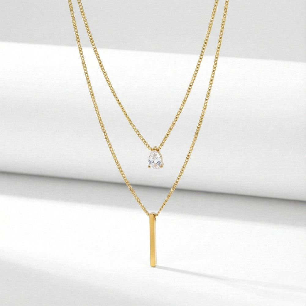 Ένα κομψό διπλό κολιέ από ατσάλι, ιδανικό για να φορεθεί καθημερινά ή σε πιο προσεγμένες εμφανίσεις. Η κοντή αλυσίδα αναδεικνύεται με μια λαμπερή λευκή πέτρα σε σχήμα δάκρυ, ενώ η δεύτερη αλυσίδα ολοκληρώνεται με μια sleek χρυσή μπάρα που προσδίδει μοντέρνο χαρακτήρα. Το layering αποτέλεσμα δείχνει προσεγμένο και λεπτεπίλεπτο χωρίς να βαραίνει το ντεκολτέ.