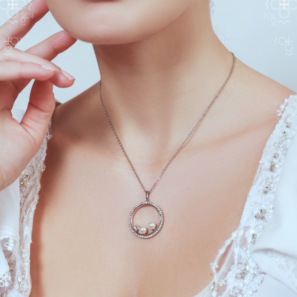 Το κυκλικό μοτίφ είναι διακοσμημένο περιμετρικά με κρύσταλλα Swarovski, ενώ στο εσωτερικό του συνδυάζονται πέρλες και διακριτικό διακοσμητικό στοιχείο. Η σύνθεση δείχνει κομψή και προσεγμένη χωρίς υπερβολή.