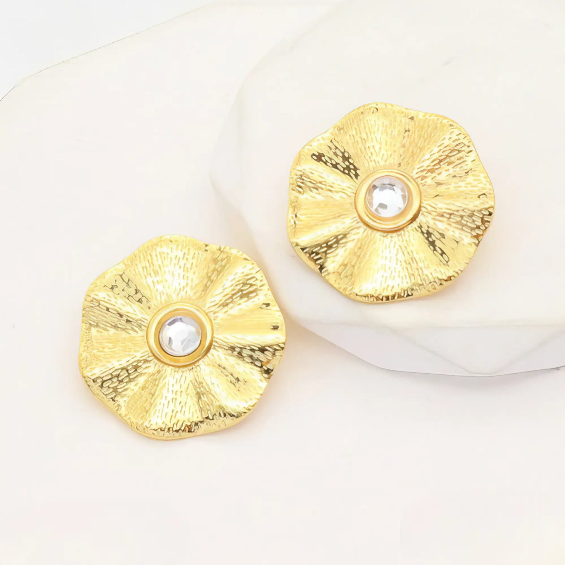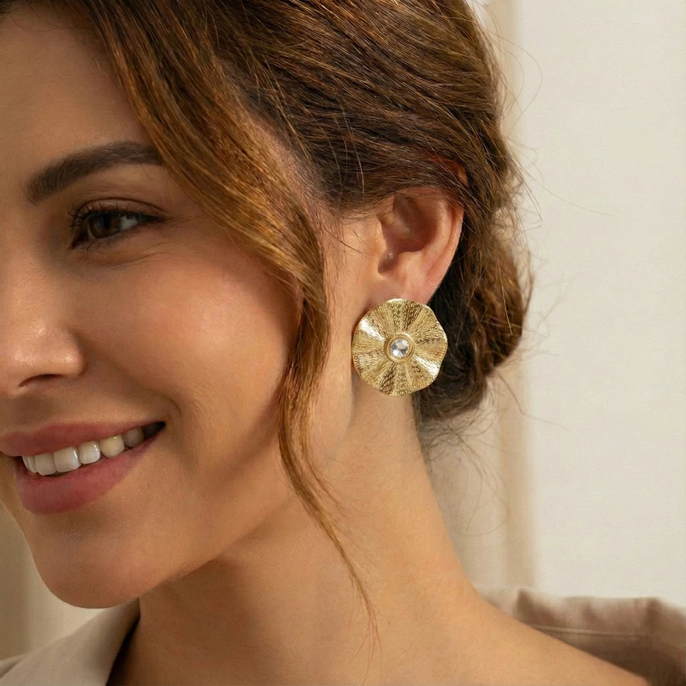 Λαμπερά και κομψά, αυτά τα σκουλαρίκια σε χρυσό χρώμα αναδεικνύονται από τη στρογγυλή λευκή πέτρα στο κέντρο. Ένα σχέδιο που προσθέτει φινέτσα και λάμψη σε κάθε σας εμφάνιση. Ιδανικά για συνδυασμό με βραδινό μακιγιάζ ή κομψά office looks.