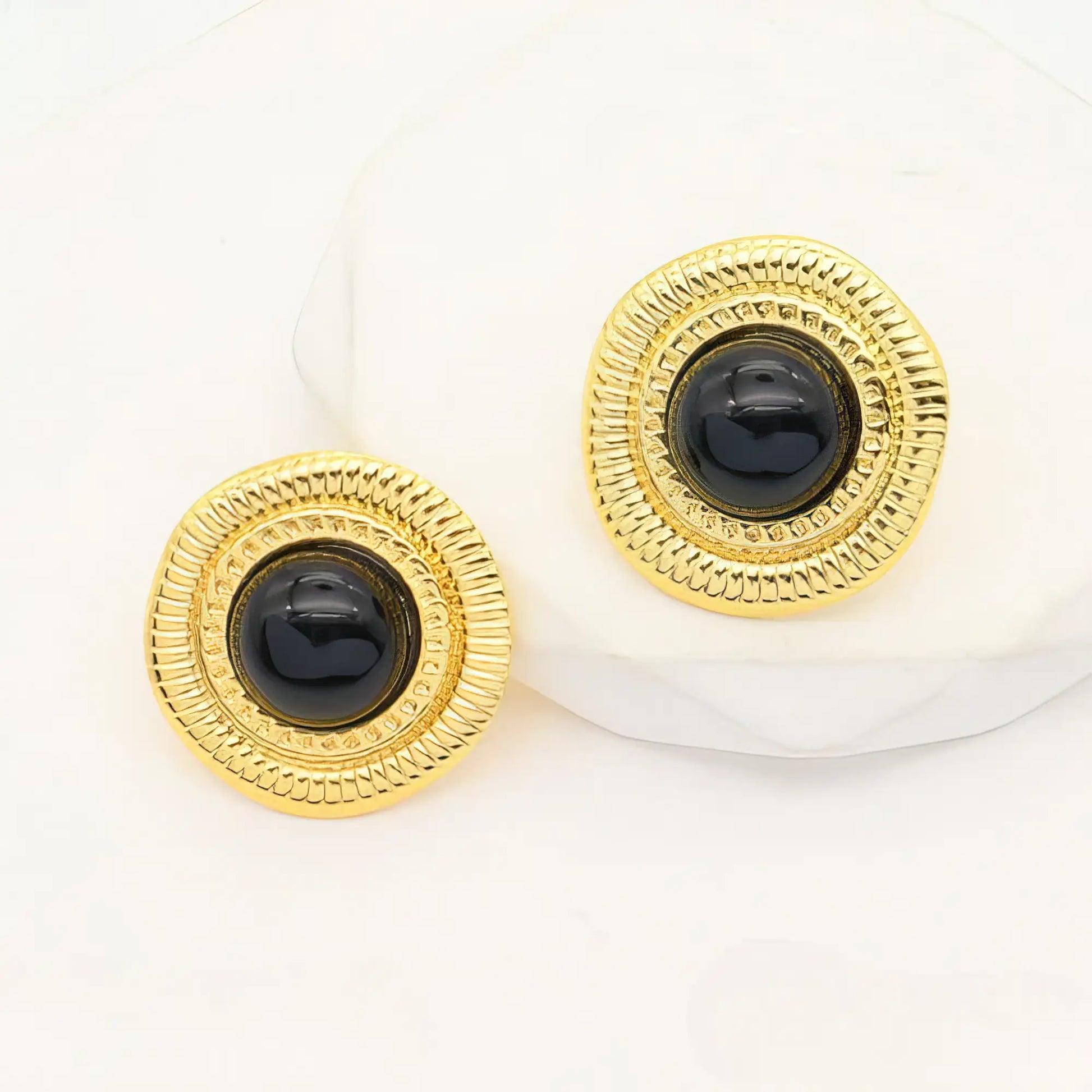 Κλασικά και εκλεπτυσμένα, αυτά τα σκουλαρίκια με μαύρη πέτρα στο κέντρο δίνουν δυναμικό χαρακτήρα σε κάθε εμφάνιση. Τέλεια επιλογή για formal looks ή κομψά βραδινά σύνολα.