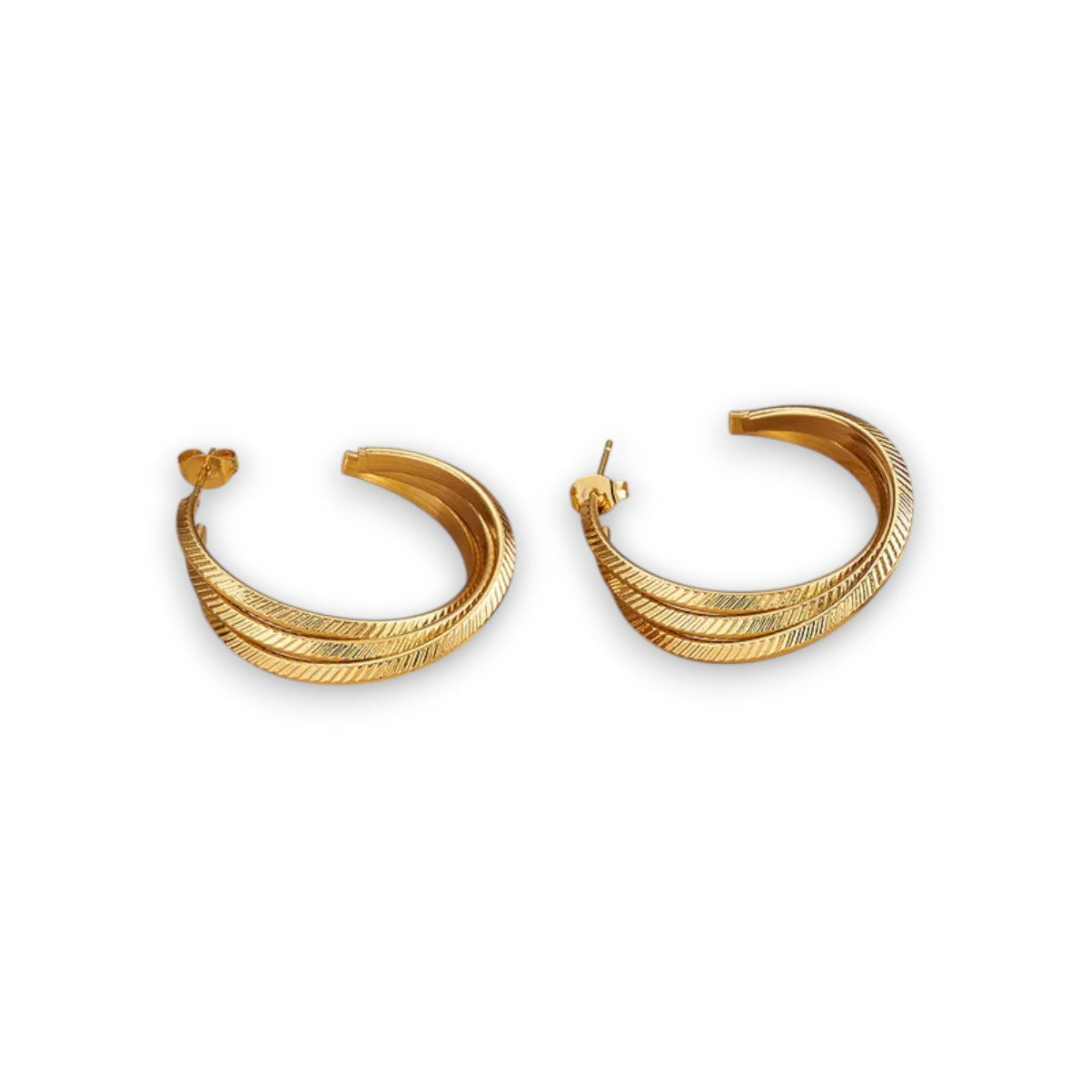 Χρυσοί κρίκοι από ανοξείδωτο ατσάλι με έντονη ανάγλυφη υφή και τριπλή γραμμική λεπτομέρεια. Το σχέδιο θυμίζει κοσμήματα υψηλής αισθητικής και δίνει χαρακτήρα χωρίς υπερβολή. Δεν είναι απλοί κρίκοι, έχουν καθαρά statement ταυτότητα.