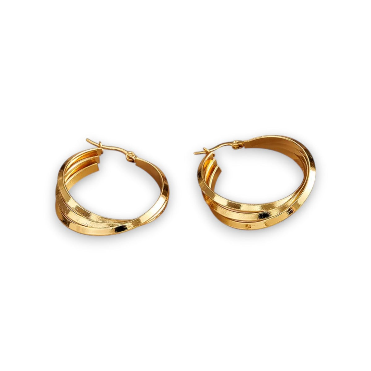 Κομψοί χρυσοί κρίκοι από ανοξείδωτο ατσάλι με καθαρές γραμμές και διπλή λεία επιφάνεια που αντανακλά το φως. Minimal αλλά όχι αδιάφοροι, έχουν όγκο όσο πρέπει για να φαίνονται χωρίς να βαραίνουν το αυτί. Είναι από αυτά τα σκουλαρίκια που δείχνουν “ακριβά” χωρίς να φωνάζουν.