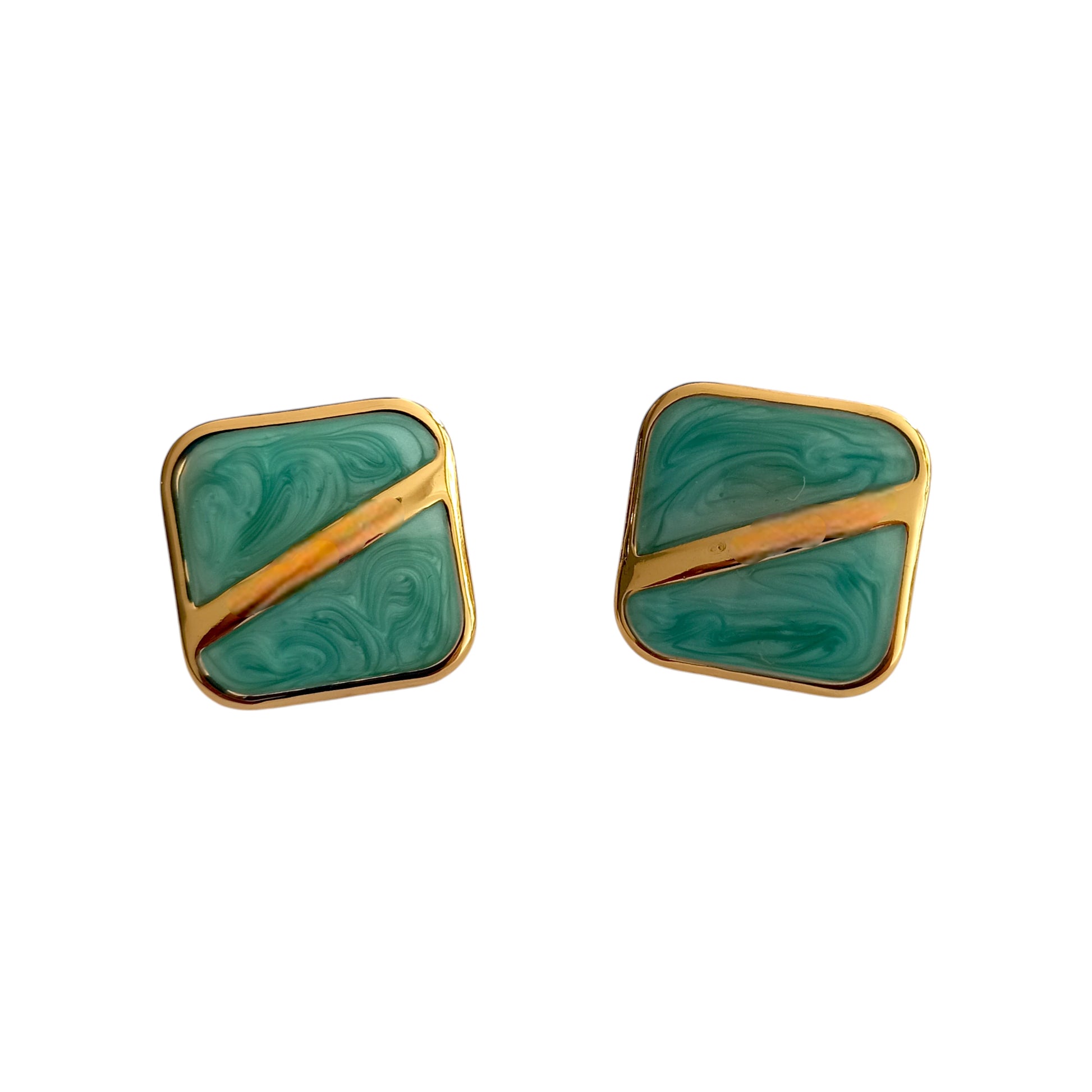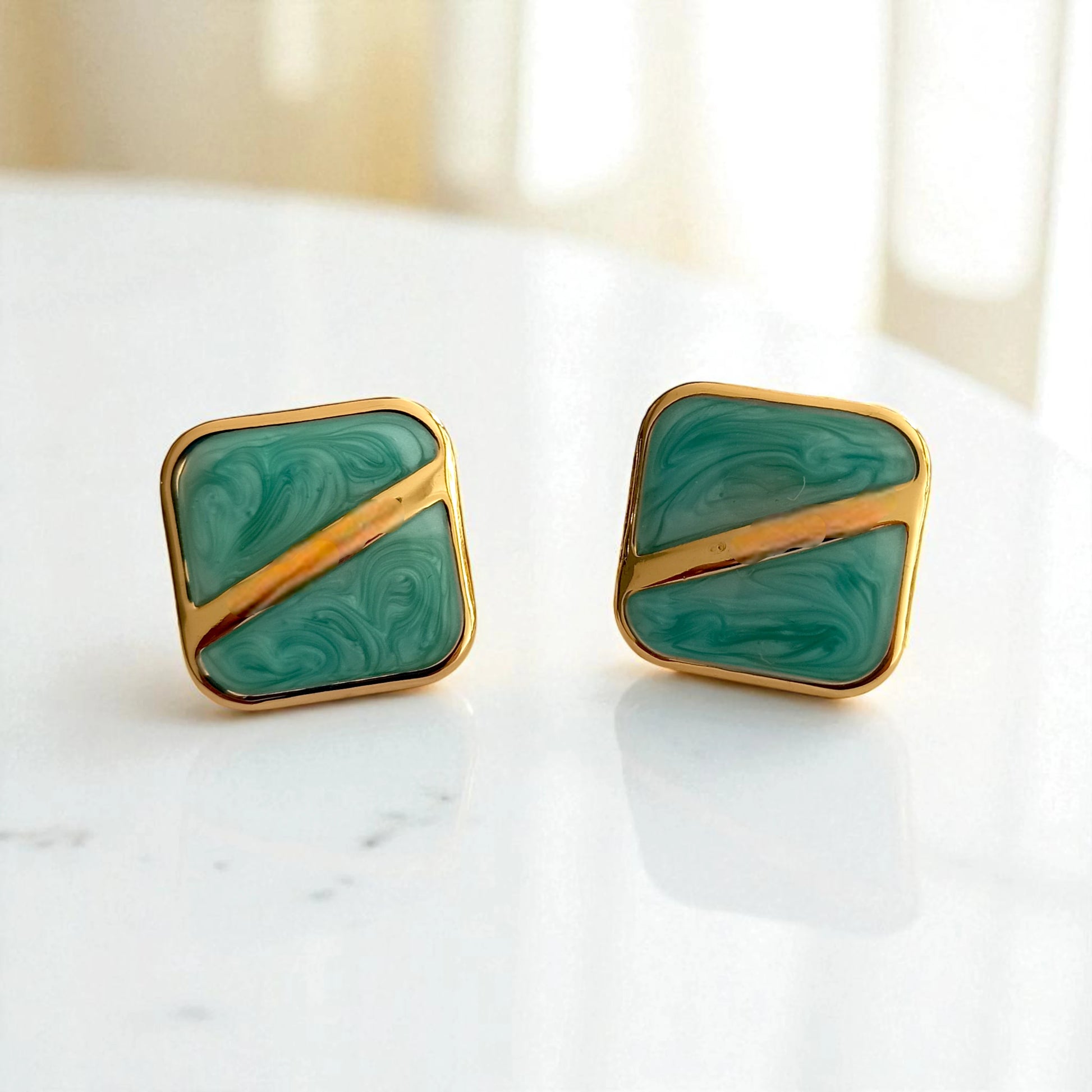 Εντυπωσιακά και μοντέρνα, αυτά τα τετράγωνα σκουλαρίκια με πράσινο swirl σμάλτο και χρυσή διαγώνια λεπτομέρεια αποπνέουν ρετρό κομψότητα. Ιδανικά για να προσθέσουν χρώμα και στυλ σε κάθε εμφάνιση.
