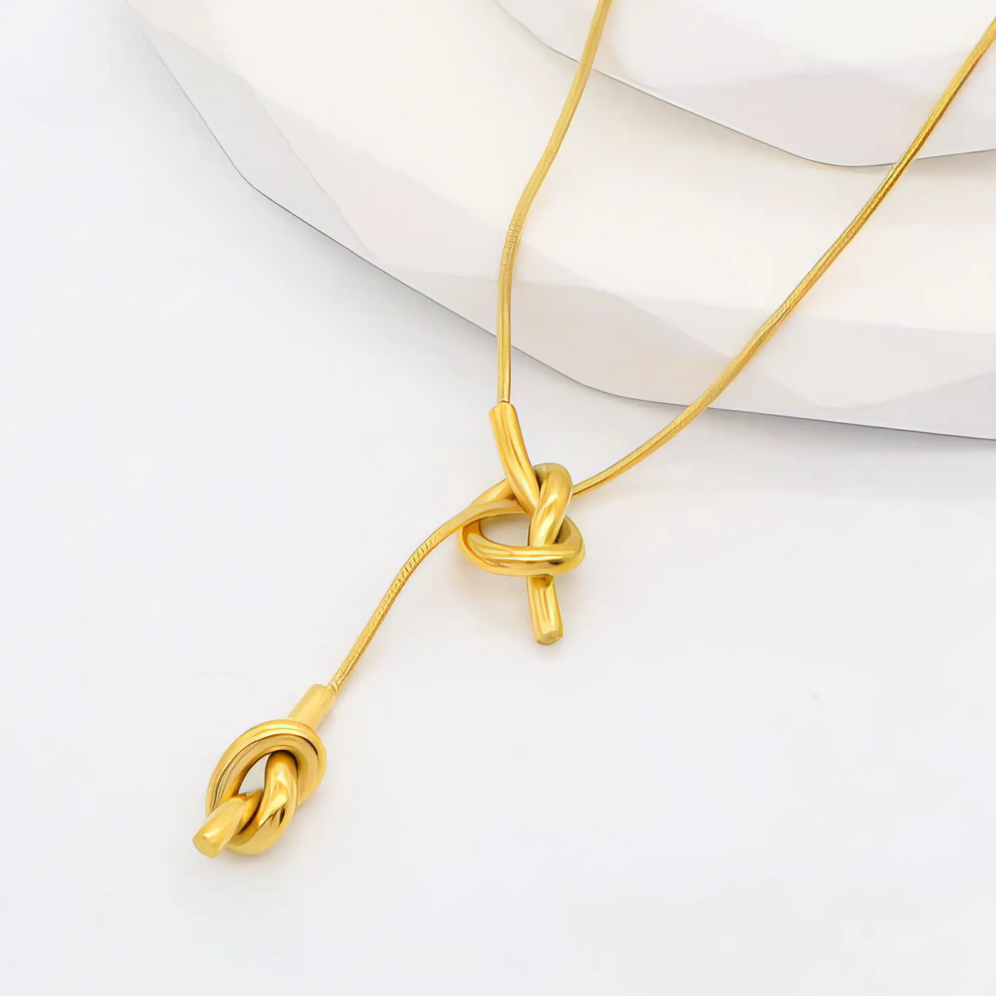 Αναβάθμισε το στυλ σου με αυτό το κομψό χρυσό κολιέ από ανοξείδωτο ατσάλι, με μοναδικό σχέδιο κόμπου που συμβολίζει την ενότητα και τη δύναμη. Μοντέρνο, λιτό και ξεχωριστό, είναι η τέλεια επιλογή για καθημερινή ή βραδινή εμφάνιση.