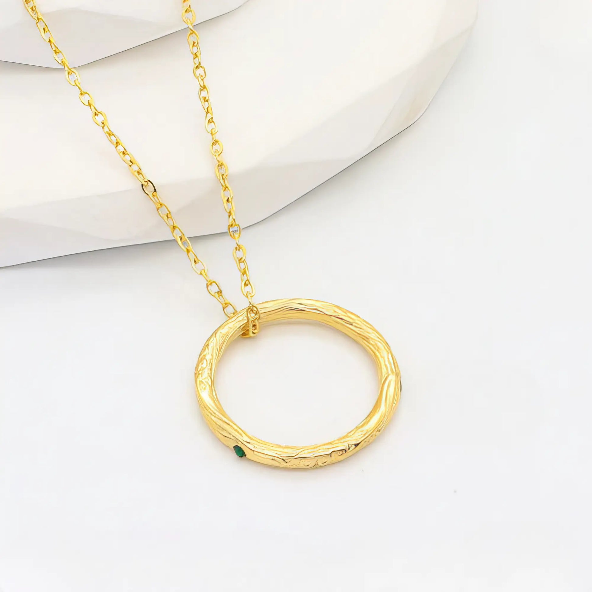 Χρυσό Ατσάλινο Κολιέ με Στρογγυλό Κρεμαστό – Ανάγλυφη Λεπτομέρεια & Πράσινη Πέτρα